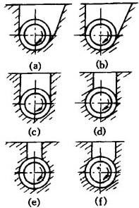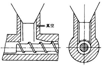 图2-36中(a)类主要适用于带状料的加入,而不宜用于粒料和粉料;(c)和(e)类在简易的挤出机用得较多;(b)、(d)、(f)这三类用得较多,其中(b)类的右口壁倾斜角一般为7°~15°或稍大于此值,有时其左口壁也设置一倾角。(b)和(f)类加料口之左壁设计成垂直面,但向中心线方向偏移1/4内径,而其中(f)类的右壁下部向中心的倾斜角约45°。实践证明:(b)和(f)类加料口不论对粉料、粒料和带状料都能很好适应,因此,用得最多。