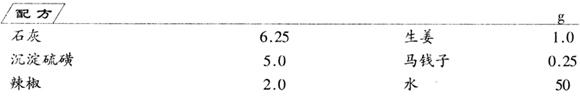 (1)原料准备 将沉淀硫磺研细。马钱子晒干研细,并用质量为1/10的水量浸泡3~5d。生姜切成碎片。辣椒切碎。