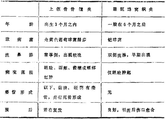 释义 | 新生儿上颌骨骨髓炎 【病因】 由于分娩时感染或母亲乳头不洁,病菌通过未萌出的乳牙进入上颌骨。常见的致病菌为金黄色葡萄球菌。 【临床表现】 在出生后3个月内,婴儿突然面颊眼睑红肿,一侧鼻腔流脓,齿槽及硬腭也可能红肿。几天以后,形成脓肿或脓外溢,并在内眦、眶下或齿槽出现瘘管,较晚者可能有死骨形成。患儿在病初起时,常伴有高热。 【诊断】 根据症状及检查进行诊断。急性期内,应与鼻窦炎并发的眼眶蜂窝织炎相鉴别(见下表)。 【预防】 注意新生儿口腔卫生。 【治疗】 早期必须用足量抗菌素控制感染。脓肿应及时引流。眶部脓肿切口应选在眶外下部;齿槽脓肿可经口腔切开排脓。如有死骨,可待后期切开取出。 上颌骨骨髓炎与眼眶蜂窝织炎鉴别表 |