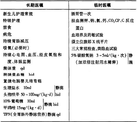 说明:1.禁食,胃肠减压至症状消失,粪常规及隐血试验均正常,轻者5~7天,重者10~14天。能进食时,先鼻饲糖水,次日改稀释奶,然后改全奶,每次喂前应抽胃液,如有潴留则不加量。禁食期予全胃肠外营养(TPN)支持;进食初期予部分胃肠外营养(PPN)。