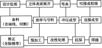释义 | 施工图样准备 在将各种金属板材或型材制成工程所要求的一定形状和尺寸的构件及制品的过程中,由图面的设计到成品的完成,最初的成品设计与制图是最为重要的。笔者通过多年的实践经验并实习和参观了上海、大连、陕西、湖北、河南等地的各大钣金厂,整理出钣金成品流程与加工生产的关系,如图1-1所示。 图1-1 钣金成品流程与加工的关系 (一)钣金结构构形设计 钣金结构设计时,除要保证满足使用性能外,还应具有良好的工艺性能、允许适合的曲面流线形外形,以减少材料的消耗和工序次数,使模具结构简单,生产率高,冲压质量好。 1.构件外表面的设计 设计构件外形时,不可展曲面不仅绘制不出准确的展开图,而且即使有合适的展开图,在卷曲和弯制中也必然会产生扭曲,增加制作难度,因此应尽可能选用可展曲面作为构件的表面。 在可展曲面中,由于切线曲面的展开和制作较为复杂,在无特别需要时,最好选用柱面或锥面形状。当构件表面需由几个曲面组成时,或由曲面和平面混合组成时,应使相邻表面间光滑过渡,即要求两曲面在分界处相切,不产生折棱或交线。 2.构件各结合面的设计 绘制展开图时,两曲面的结合线的作图,不仅繁琐,又易产生误差。所以在条件允许时,应尽量使结合面为平面形状,且平面与平面之间的结合线是平面曲线,以便利用平面曲线的投影有可能是直线这一性质,达到简化作图的目的,从而也提高了作图的精度。 然而,当构件制造精度不高时,也可考虑采用可展性差但制作简便的曲面。 (二)钣金零件结构分析 钣金加工的首要任务是放样前必须画好、识读、看懂零件视图,才能进行放样号料。零件图是设计人员为表达清楚所设计的钣金构件或部件上某一零件的结构和装配关系而单独画出的零件视图,零件图是钣金加工和产品检验的依据,是生产中的重要技术文件。 在进行单件或少量钣金制作时,看懂构件按正投影原理画出的零件视图,尤其显得特别重要。因为只有在看懂零件图的基础上,才能进一步了解分析构件的形状、组成部分、尺寸、用途和有关技术要求,继而弄清各部分的投影关系和尺寸要求,并确定可变动与不可变动的部位及尺寸,从而判断零件有否规定不明确及需变动部位的形状及尺寸、材料是否适于冷冲压、尺寸和加工基准是否需换算、精度和质量要求能否保证、产品技术条件是否明确需补充等,以便为后续工序奠定良好的基础。 (三)展开图及放样图的绘制 展开与放样过程是钣金加工整个工作过程的核心,始终围绕着号料与制作,一般要经过绘制放样图、展开图、号料、样杆、样板制作及校核等环节,整个环节在生产过程中起着极其重要的作用。 1.放样图绘制 放样下料是整个钣金生产的第一道工序,无论是不能依据计算直接求出料长的桁架类构件,还是必须展开的复杂形状壳体类构件,均须按照视图所规定的形状和尺寸,用1∶1的比例按正投影原理投影,并进行结构工艺性处理、必要的计算及展开,然后将构件全部或部分图样准确绘制到纸板或钢板上,即绘制出放样图,以便为获得产品制造过程所需要的数据、样杆及样板草图等。 最终依据放样图,在板料或型钢上画出零件真实的轮廓和真实的孔口形状,以及与之连接构件的位置线、加工线等,随后再按所画出的形状量出用料尺寸或制作样杆及样板,以便后续进行大批量切割下料。 2.展开图绘制 壳体类复杂构件展开作图是放样过程中最为关键的一步,也是全过程的难关。正确绘制展开图,不仅是放样号料的依据、保证构件质量的关键,同时也对降低材料消耗、提高劳动生产率起着不可忽视的作用。 展开作图有图解法和计算法两种,图解法是根据展开原理得到的,具有作图简捷、直观等优点,是目前广泛采用的方法。计算法是将图解法的作图方法改为解析式表示,计算出点、线的位置和形状,然后绘出图形或直接下料的方法。这种方法具有准确度高的优点,且随着计算机技术的发展,有被广泛采用的趋势。 在展开作图过程中,由于工程中构件形状千变万化、大小不同、画法不一,经验不足者必须掌握一些展开放样的规律和方法,才能逐步攻克这一难关。本书后续除详细介绍了图解法作图原理和具体步骤、计算法作图原理及具体方法外,还叙述了实形图、展开图和中性层展开作图原理及方法。 |