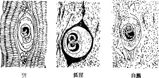释义 | 旋毛虫病 旋毛虫病是由毛首目毛形科的旋毛虫引起的人畜共患的一种重要寄生虫病。猪、犬、猫、鼠类、狐狸、狼、貂、野猪等均能感染。人也能感染本病,因此,本病在公共卫生上甚为重要。 【流行特点】猪感染旋毛虫主要与喂饮污染有旋毛虫的洗肉废水、废弃碎肉渣及副产品有关;其次是与感染旋毛虫的鼠类等有关。人类感染旋毛虫病主要是由于食用了含有旋毛虫的腌制与烧烤不当的、生的或未煮熟的猪肉、狗肉等而受到感染,此外,切过生肉的菜板、案板,由于生熟不分,污染食品而造成污染。 旋毛虫成虫与幼虫的发育,同在一个宿主体内完成。寄生于宿主小肠的成虫称肠旋毛虫;寄生于宿主肌肉组织中的幼虫称肌旋毛虫(图2-6)。肌旋毛虫常寄生于膈肌、舌肌、喉肌、颈肌、肋间肌和腰肌等处,其中以膈肌感染率最高。 图2-6 形成完整包囊的肌旋毛虫 【临床症状】猪对本虫有很强的耐受性,一般无临床症状,但在严重感染的初期,体温升高,下痢,有时眼睑和四肢水肿,呕吐,消瘦。病猪喜卧,不愿走动,呼吸困难声音嘶哑,吞咽困难。多于4-6周后康复,死亡极少。 【病理剖检】旋毛虫成虫对肠影响不显着。主要变化在肌肉,被肌旋毛虫侵害的肌肉发生变性,肌纤维肿胀,横纹消失,甚至发生坏死,肌间结缔组织增生等。 【诊断】生前诊断比较困难。目前认为利用血清学方法是特异、快速、灵敏、简便的生前诊断方法,常用的有酶联免疫吸附试验(操作方法附后),目前,我国某些重点疫区已采用该法进行全面普查。死后最确实的方法是采用压片镜检法(方法附后)和消化法检查肌肉中有无旋毛虫的幼虫。 【处理】在24个肉片标本内,发现包囊或钙化的旋毛虫不超过5个者,横纹肌和心肌高温处理后供食用;超过5个者,横纹肌和心肌作工业用或销毁;皮下及肌肉脂肪可炼食用油,体腔内脂肪不受限制供食用;肠可供制肠衣,其他内脏不受限制供食用。 |