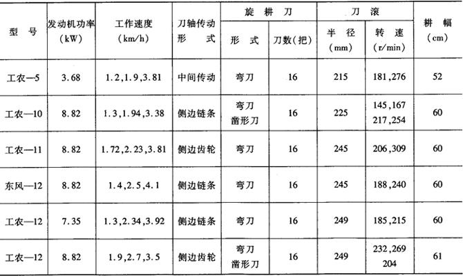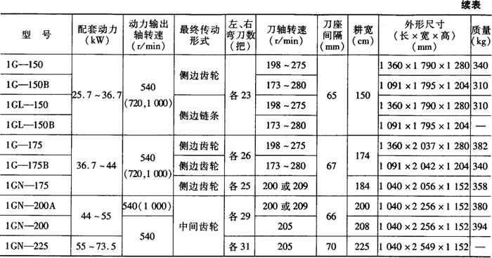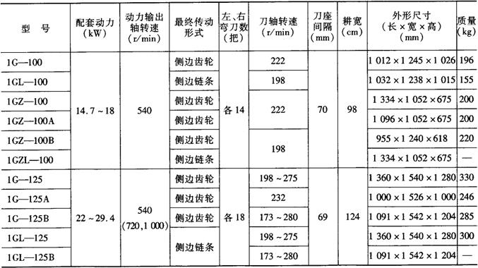 注:型号代号含义:1——耕耘整地机械,G——旋耕机,L——链条传动,Z——直接传动,N——中间传动,三位数——耕幅(cm),A(或B)——变型。 表5-5 手扶拖拉机配套旋耕机主要技术规格