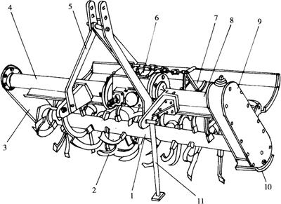 (二)旋耕机的一般构造 旋耕机主要是由机架、传动系统、旋转刀轴、刀片、耕深调节装置、罩壳等组成(图5-8)。