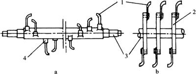 图5-9 刀轴 a.刀座式 b.刀盘式 1.刀片 2.刀盘 3.刀轴 4.刀座 2.机架 卧式旋耕机机架呈矩形,由前梁(左右主梁)、左右支臂及作为刀轴的后梁所组成。前梁为铸造圆管,中间有齿轮箱,两侧为支臂,其中一侧装有传动箱。 3.传动部分 由拖拉机动力输出轴传来的动力经万向节传给中间齿轮箱,再经侧边传动箱驱动刀轴回转(图5-10)。