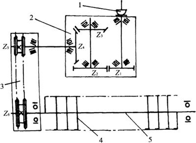 图5-10 旋耕机侧边链传动示意图 1.万向节 2.中间传动箱 3.侧边传动箱 4.刀片 5.刀轴 中间齿轮箱内的一对圆柱齿轮Z1与Z2可以变换安装或根据农艺要求选择另外一对圆柱齿轮,以改变转速。旋耕机刀轴转速一般为198~ 275r/min。 中间传动箱采用圆锥齿轮传动,也有用螺旋齿轮的。侧边传动箱有齿轮传动和链轮传动两种。链轮传动零件数目少,重量轻,结构简单,加工精度要求低,但目前因链条易磨损断裂,使用寿命较短。齿轮传动比较可靠,但加工精度要求较高,制造复杂。我国旋耕机系列设计采用齿轮-链轮和全齿轮传动两种方式。 4.耕深控制装置 常用的是滑橇式和限深轮式两种。滑橇式安装在机架底部,调节滑橇与刀轴的相对距离,可以改变耕深。滑橇还起限深作用,一般用于水田作业。限深轮安装在旋耕机后部,由套管、升降丝杠、轮叉等组成。用于旱地作业。 |