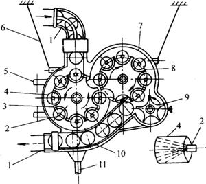 1-斜槽 2-喷嘴 3、8、9星形轮 4-金属罐 5-环 6-连接杆 7-机壳 10-滑道 11-排水管