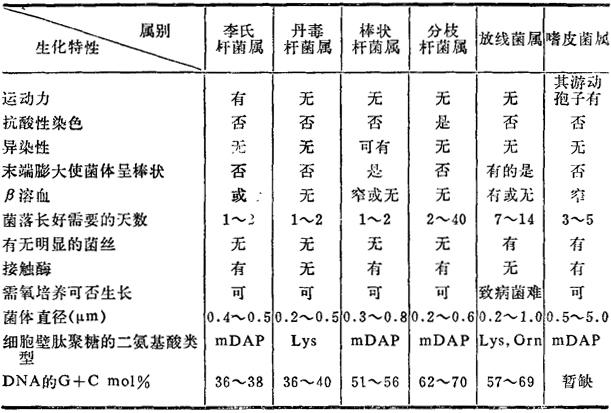 无内芽孢的革兰氏阳性杆菌,与兽医微生物较为密切者六属,即李氏杆菌(李斯特杆菌)属(Listeria)、丹毒杆菌属(Erysiepelothrix)、棒状杆菌属(Corynebacterium)、分枝杆菌属(Mycobacterium)、放线菌属(Actinomyces)及嗜皮菌属(Dermatophilus)。其区别见表18-1。