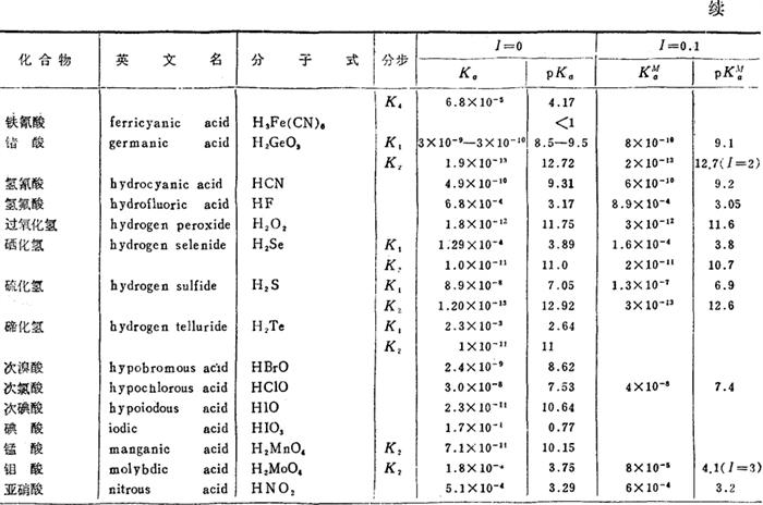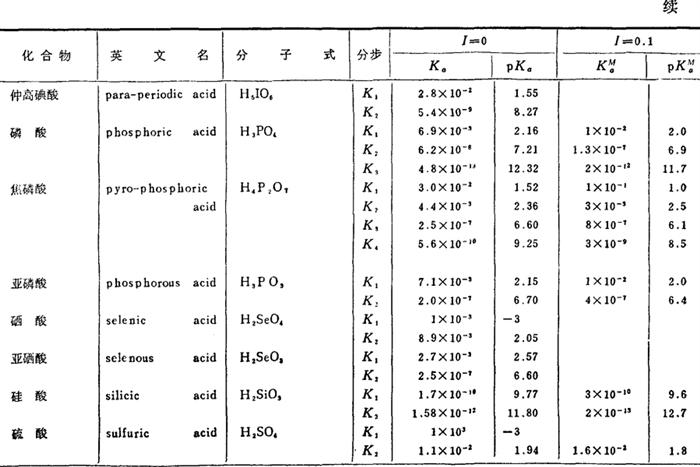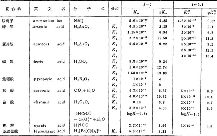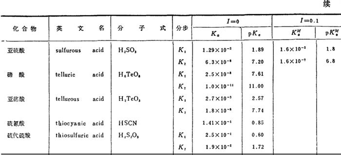 无机酸在水溶液中的离解常数(25℃)(按英文名顺序排列)