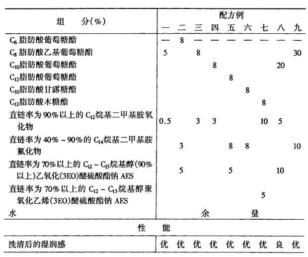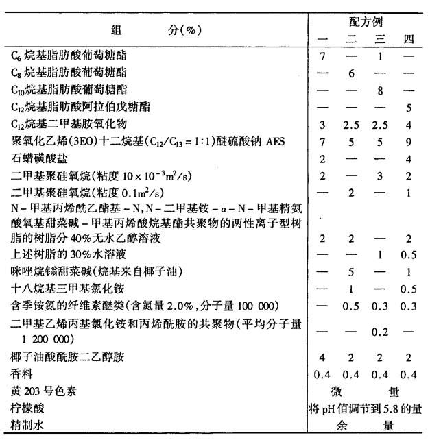 释义 | 无润湿感的清洗剂和香波 本清洗剂的特点是洗后无润滑感或湿润感,但其洗涤性能优良。 普通清洗剂中含有的表面活性剂,易于被皮肤或硬质表面吸附,因此有润湿感,在清洗后仍然有这种不良手感,通常必须用大量的水清洗,操作不方便,而且也不经济。而本品很少被硬质表面或皮肤所吸附,易于洗净,而且其洗涤性仍然很优良。本清洗剂含有碳原子数6~18的脂肪酸与碳原子数5~6的单糖类或其烷基醚酯化反应而成的糖酯类表面活性剂(1%~30%,最好为5%~25%)和烷基叔胺氧化物(0.5%~10%,最好为2.5%~5.5%)。 本品可以用作硬质表面的清洗剂,也可以用作皮肤清洗剂和毛发清洗剂(洗发香波)。例如: 葡萄糖 5.15g(27.64mmol/L) 癸酸甲酯 1.03g(5.55mmol/L) 耐热性脂肪酶(丙烯酸树脂固定化的) 100mg 用作脱甲醇剂的分子筛5A 10g 在搅拌中加热回流24小时,得葡萄糖单癸酸酯,即C10脂肪酸葡萄糖酯。经采样分析,纯度为98%,产率为70%,三酯以上的多酯含量在1%以下(日本特许公开:3-76593)。 由下表所列配方组成的清洗剂,在洗清后手感良好: 由下述配方组成的液体清洗剂实用性好,无润湿感,洗涤速度快: C8烷基脂肪酸葡萄糖酯 30% C12高碳醇聚氧化乙烯(6EO)硫酸酯钠盐(直链率40%) 5% 分支C12单烷基二甲基胺氧化物 8% 角蛋白水解物(平均分子量为1000) 0.1% 苯甲酸钠 2% 对甲苯磺酸钠 4% 乙醇 7% 烷醇酰胺 2% 香料 0.4% 色素 0.01% 柠檬酸钠 0.1% 水 其余 由下表所列配方组成的香波使用后无润湿感且洗涤速度快: 以下配方的香波,在实际使用时无润湿感,洗涤速度快: C8烷基脂肪酸葡萄糖酯 15.0% C12烷基二甲基胺氧化物 3.0% 聚合物-JR-400阳离子化纤维素 0.2% 山嵛醇基三甲基氯化铵(平均分子量404) 2.42% 丙二醇 5.0% 聚氧化乙烯(平均40EO)硬化蓖麻油衍生物 2.0% N-十二烷基二甲基氨基乙酸甜菜碱 5.0% 色素、香料 适量 去离子水 余量 以下配方的香波可作为体用香波,使用时无润滑感,而且洗涤速度快: C10烷基脂肪酸葡萄糖酯 30.0% C14单烷基二甲基胺氧化物 2.5% 椰子油脂肪酸甲基-3-丙氨酸钠 3.0% 十二烷基咪唑烷基甜菜碱 10% 二缩丙二醇 8.0% 芦荟提取物 0.5% 防腐剂、整合剂 适量 色素、香料 适量 去离子水 余量 (日本特许公开:05-88919) |
