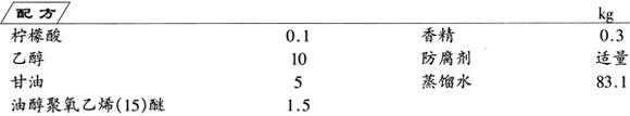 将柠檬酸、甘油溶于蒸馏水制成水剂;将香精、油醇聚氧乙烯(15)醚、防腐剂溶于乙醇,制成醇剂。然后将醇剂和水剂混合,搅拌均匀,过滤、灌装,即得成品。