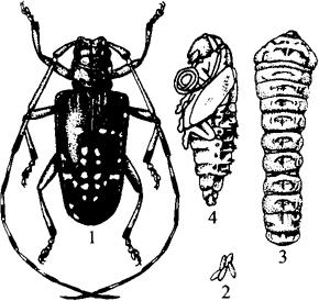 释义 | 星天牛 【学名】 Anoplophora chinensis Forster。 【别名】 钻心虫。 【分布与为害】 四川、云南、河北、山西、山东、广西、广东、贵州、陕西、辽宁、浙江、福建、江苏、安徽、湖北、湖南、海南等地均有分布。寄主有悬铃木、杨、柳、榆、桃、桑、柑橘、西府海棠、梨、樱花、木芙蓉、月季、玫瑰、山茶、蔷薇等。幼虫蛀食植株主干和根,环食皮层时,造成全株死亡。蛀食严重时,遇风折断。 【形态特征】 成虫体长20~39毫米,宽8~15毫米。体和鞘翅漆黑色,有光泽。鞘翅上有许多小白斑,基部密布大小不等的小颗粒。前胸两侧有刺突,背板有明显的瘤。头部和腹面被银灰色细毛。触角细长,雄虫触角长为体长的2倍。卵为椭圆形,乳白色,长约3毫米。孵化前呈黄褐色(图9-45)。老熟幼虫体长54毫米,圆筒形,乳白色,前胸背板前缘左右面各有2个黄褐色飞鸟形纹,其后有1黄褐色凸字形硬板。蛹纺锤形,黄白色,翅芽超过腹部第三节后缘。离蛹。 图9-45 星天牛 1成虫 2卵 3幼虫 4.蛹 【生活习性】 1年1代。以幼虫在树干内越冬。翌年5月上旬开始化蛹。蛹期19~33天。5月末成虫羽化率达24%左右。成虫羽化后,取食叶片补充营养。中午前后日光下飞翔活跃。6月20日前后产卵高峰。产卵前,雌虫在树干上咬皮层呈“八”字或“⊥”字刻槽,然后产卵1粒于其中,大部分产于茎干基部。7月底或8月上旬为孵化高峰。幼虫先在皮层下盘旋蛀食,至9月中旬幼虫开始蛀入木质部,渐向根部蛀食,11月进入越冬。 【防治方法】 (1)人工防治。幼虫未蛀入木质部之前,树皮外可见酱油汁状汁液流出,用小刀挑杀内中幼虫。 (2)幼虫盛孵末期喷25%园科3号200倍液1次。幼虫钻入木质部后,4月份,越冬幼虫开始活动、未化蛹前,从蛀孔插入磷化铝毒棒,毒杀幼虫。 (3)放肿腿蜂。在幼虫孵化期,7月下旬至8月上旬,每株放蜂60头(约二管),将盛有肿腿蜂的玻璃管缚在树干下部,雨天无效,天气干燥效果好。 |