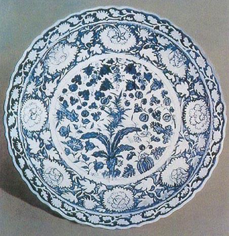 释义 | 景德镇窑 如上所述,元代景德镇窑有了很大发展,其生产的品种繁多,但从装饰品种上说,大致可分为两类,即单色釉和釉下彩绘。 1.单色釉瓷 青白瓷 青白瓷是宋代景德镇主要品种。元代继续烧造,但胎、釉、造型、装饰方法等和宋有所不同。元代青白瓷的胎子很白,坚致,细密,胎体较厚;施釉略厚,白中透青,不透明,除了部分光素无纹的以外,也有用刻、划、印、堆塑、点彩、镂雕等方法装饰的。常见刻划纹饰有云龙、卷枝、卷草、牡丹、莲瓣等;或在盘和碗内心凸印朵花。堆塑常用于器盖或器身的装饰,如江西省博物馆收藏的狮钮盖梅瓶,盖雕成莲座形,上塑一昂首、蹲踞、翘尾的狮子;首都博物馆收藏有一件观音坐像,法冠及全身披卦缨络纹;天津艺术博物馆收藏的“福如东海、寿比南山”八方串珠高足杯及影青罐腹部堆塑的“月影梅”纹饰(图46);以及一些器物上的“S”形耳饰,兽面、朵花等附加饰物。元代镂雕瓷相当少,是十分珍贵的品种,如山西省大同市博物馆所收藏的影青瓷枕,器身镂雕成广寒宫,周边围以杆栏,宫内有嫦娥、童子、观音及其它诸神;辽宁博物馆馆藏的镂雕人物高足杯,杯身呈五面,塑五个花瓣,串珠开光,每个开光中都镂雕手持荷叶的童子,非常精美。点彩是用富含铁元素的彩料信手点染,高温烧成的褐色斑点,没有规律。元代青白瓷器型较多,除了日常用的盘、碗、高足杯、瓶、罐、炉以外,还有一些新器型如葫芦形的执壶、扁执壶、多穆壶、匜(图47)、砚滴、笔山等。体形通常厚重饱满,瓶、罐等器下腹和胫清瘦,盘、碗体大而圈足小,都有头重脚轻的感觉。部分瓶、罐下连器座(图48)。底足一般无釉,有火石红色斑点。宋、元青白瓷的区别在于:①宋代影青瓷胎子轻薄、施釉薄,清澈透亮,青的成分多一些,而元的胎子略厚,施釉亦较厚,透光度差,青白釉偏白;②在装饰方面,宋代主要是刻、划、印,纹饰飘逸流畅,元代则多堆塑、镂空或光素无纹,元代纹饰流行的有云肩纹、缨络纹、宽体莲瓣等,并注重附加装饰,如“ 图46 元青白釉贴塑梅花纹罐 图47 元青白釉匜 图48 元连座瓶 白釉瓷 白釉也称为卵白釉。元代白釉瓷数量不多,但制作精细。这类瓷器胎子极细白,坚致,胎体较厚;施釉亦厚,白中泛青似鹅卵,润如堆脂;多印花装饰,有云龙、龙凤、花卉、缠枝莲、卷草等(有的因为釉子很厚,故纹饰模糊,不甚清晰)。河北省博物馆收藏的白釉龙纹盘,盘心印对舞的龙纹,纹饰清晰严谨;白釉小酒杯,做成八瓣莲花的形式;两者虽然装饰风格不同,却代表了元代瓷器不同的装饰手法。元代白釉瓷主要器型有盘、碗、杯、高足碗、荷叶式盏托、狮耳大罐、折方执壶等。盘一般为敞口,直腹;碗为敞口,浅腹,折腰,盘和碗圈足很小(图49)。由于部分碗、盘口沿内壁相对印“枢府”、“太禧”等字,因此这类瓷被后人称之为“枢府瓷”。“枢府”是元代军事机构枢密院的简称,“太禧”是元代专掌祭祀之职的“太禧宗禋院”的简称,带这类款识的应是元代官府定做或征用的瓷器。由于这类瓷器制作精细,又有官府名称,被后人认为是元代官窑的产品(图49)。无论是否官窑所产,元代烧制白瓷的成功经验,却为以后釉下、釉上彩绘瓷的高度发展,奠定了坚实的基础。 图49 元枢府釉盘 蓝釉瓷 蓝釉瓷是元代景德镇创烧的新品种。它是以钴蓝为着色剂,经高温一次烧成的。元代蓝釉瓷有的光素无纹,有的饰有刻白纹饰,有的加绘金彩。扬州市博物馆收藏的一件蓝釉划白龙纹梅瓶,通体施蓝釉,肥厚莹润,色深似宝石,非常均匀;白龙昂首曲颈,三爪尖利,须毛飘逸。具体做法是先在成型的胎子上划出云龙纹,上罩白釉,再在其它没有纹饰的地方施蓝釉,蓝白色彩对比强烈醒目,是国内外罕见的珍品(彩版35)。故宫博物院收藏的一件蓝釉白龙纹盘,其工艺方法和装饰效果与扬州博物馆的梅瓶相似。1964年河北保定出土的现藏于故宫博物院的蓝釉金彩匜和杯等,又具有另一种风格,在高温烧成的蓝釉上,用金彩绘朵莲或梅花,经低温烘烤而成,金碧辉煌,十分珍贵。 35.霁蓝釉白龙纹梅瓶 元 红釉瓷 元代景德镇创新品种,是以铜红为着色剂、经高温在还原气氛中烧成的。由于铜红的烧成技术比钴蓝还要难以掌握,因此成品极少。经过几百年的流传,到现在几乎不见传世品,仅元大都遗址有少量出土,只有盘、碗、印盒等小件器物。其中红釉盘内壁上印双龙,盘心划三朵云纹,红釉深浅不一,颜色不纯正,说明元代工匠还不能真正控制红釉的烧成气氛。直到明代永乐年间,才烧出了真正鲜红的釉色。 2.釉下彩绘瓷 青花 青花是用钴料在白色坯胎上绘纹饰后罩透明釉,在还原气氛中经高温一次烧出的白地蓝花瓷器。不罩釉烧出来的纹饰是黑色的。我国使用钴料绘纹饰的历史应追溯到唐代。唐三彩上的蓝彩,就是用从波斯进口的钴料涂绘而成的。但唐三彩是陶器,而且钴料是绘在已烧成的素胎上经第二次低温烧制而成的,所以不能算是青花。目前国内外专家公认的唐代青花的完整瓷器,当属香港大学冯平山博物馆收藏的一件唐代白釉釉下蓝彩三足炉,是1948年河南洛阳出土的。美国、丹麦的博物馆中也收藏有唐代白釉釉下蓝彩碗和罐。另外,1975年,扬州唐城遗址出土了一块白釉蓝彩瓷片,胎子坚密,颜色较白、釉子牙白色,纹饰为蓝色的内外均绘有零碎叶纹组成的大菱形图案。以后又陆续采集到一些壶、碗、盘的残