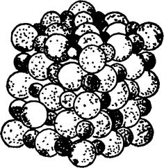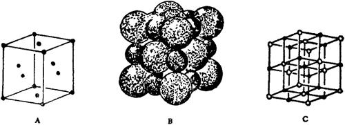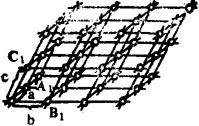 释义 | 晶体的定义和晶体的构造 1.晶体 内部质点在三维空间呈周期性重复排列的固体,或者说,是具有格子构造的固体。凡结晶颗粒能用一般放大镜分清的,称为显晶质(phanerocrystalline);凡结晶颗粒不能用一般放大镜分辨的,称为隐晶质(cryrtocrystalline)。 2.晶体的界限要素 有:晶面,即组成几何多面体的平面;晶棱,即晶面间的交棱;角顶,即晶棱的交点。所有凸多面体的界限要素关系,均服从艾列尔定律,即:晶面数(f)+角顶数(n)=晶棱数(r)+2。 完整的氯化钠晶体是由6个晶面(f=6)、8个角顶(n=8)和12条晶棱(r=12)构成的正立方体。 3.晶体内部构造最明显的特点,即质点(原子、离子、有时为分子)作有规律的排列,相同的质点在三维空间呈周期性的重复出现,成为格子构造。它是决定晶体性质(包括能自发成长为有规则的凸几何多面体的特性)的根本因素。不同的晶体内部构造不相同,现以氯化钠为例叙述如下: (1)晶格 晶体内部格子构造的简称。图2-5-1中由一些大球(代表Cl-)和小球(代表Na+)所堆成的立方体小块,是NaCl内部结构中极小的一部分;在1mm3的NaCl晶体内,包含着约7×1017个这样的立方体小块。沿着这个立方体小块棱的方向,Cl-和Na+以相等的间隔交替排列,每隔0.56402nm重复两次;而在平行于晶面的对角线方向上,Cl-或Na+各自均以0.39862nm的相等间隔连续排列;其他任何方向,情况也是这样;所有Cl-和Na+在三维空间均呈周期性重复的规则排列,构成一种格子状的构造。实践证明,所有天然产出的或人工制备的NaCl,不论其外形是否规则,内部质点都按上述规律,排成立方体的格子构造。氯化钠所以能长成有规则的立方体,就是这种格子构造决定的。 图2-5-1 NaCl的晶体结构 大球-Cl-;小球-Na+ (2)晶体几何常数 轴率a∶b∶c和轴角α、β、γ的合称,是表示晶体坐标系特征的一组参数。 ①结晶轴 在晶体中选定一个三维的坐标系作为结晶轴,即晶体中的坐标轴。标记为x轴、y轴、z轴或a轴、b轴、c轴。各结晶轴的交点位于晶体的中心。三个结晶轴的安置是:c轴上下直立,正端朝上;b轴在左右方向,正端朝右;a轴则在前后方向,正端朝前。如图2-5-2。 图2-5-2 结晶轴与轴角 ②轴角 每两个结晶轴正端之间的交角。它们是:α=b轴∧c轴,β=c轴∧a轴,γ=a轴∧b轴。见图2-5-2。 ③轴率 a、b、c三个结晶轴的单位连比,记为a∶b∶c,也称轴单位比。通常写成以b为1的连比式:A∶1∶C。式中:A=a/b,C=c/b。氯化钠晶体的轴率即写成a∶b∶c=1∶1∶1,轴角写成α=β=γ=90°。 (3)晶胞 能充分反映整个晶体结构特征的最小结构单位。由一个晶胞出发,就能借助于平移,重复出整个晶体结构。晶体结构中划分晶胞的平行6面体单位,其形状、大小与对应的空间格子中的平行6面体一致,其质点在空间分布的重复规律也与对应空间格子中的结点在空间分布的重复规律相同;两者的区别在于:空间格子中的平行六面体是由不具备任何物理、化学特性的几何点构成的,晶体结构中的晶胞则是由实在的具体质点构成的。 (4)晶胞参数 用来表征晶胞的形状、大小的一组数据,与对应的单位平行6面体参数完全一致。 图2-5-3A是从NaCl晶体结构中抽象出来的一个单位平行6面体,其表现为立方面心格子,棱长0.56402nm。图2-5-3B是从NaCl晶体结构中划分出来的一个单位晶胞,棱长(相当于相邻顶角上两个Cl-中心的间距)也是0.56402nm,晶胞参数是: 棱长 a0=b0=c0=0.56402nm 轴角 α=β=γ=90° 含分子个数Z=4,即1个CaCl分子是由4个Cl-和4个Na+按立方面心格子的形式分布、组成的。 图2-5-3 石盐晶体结构的立方面心格子(A)和晶胞(B和C) 为了便于透视后面的质点,在绘制晶胞图时,通常都把质点半径缩小,使实际上相互接触的质点彼此分开,如图2-5-3C。 4.空间格子及构成要素 (1)空间格子 如图2-5-4,相当点(即结点)在三度空间作格子状排列,称为空间格子,是表示晶体构造规律性的几何图形,由相当点在三度空间无限排列而成。空间 格子是由点构成的,这些点分布于相等的、位置平行而且充满着空间的平行6面体的顶点。 图2-5-4 空间格子 (2)行列 如图2-5-5。结点在连线上的排列,构成一个行列。行列上有两个相邻结点间的距离,称为结点间距。 图2-5-5 空间格子的行例 A0,A1,A2……一结点;a-结点距离 (3)面网 如图2-5-6。结点在平面上的分布构成面网。面网上,结点分布于各平行四边形的角顶。面网密度是指单位面积内结点的数目。 图2-5-6 空间格子的面纲 |