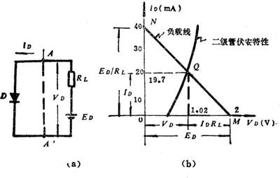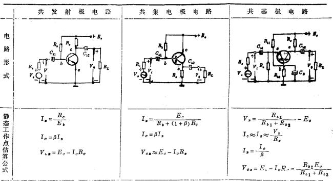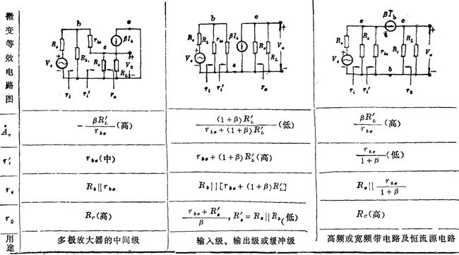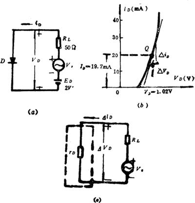 释义 | 晶体管电路分析方法 (一)晶体二极管分析方法 1.图解分析方法 (1)在非线性元件二极管D两端的AA′处把电路划分成线性电路和非线性电路两个部分。 (2)用图像表示非线性部分的电压电流关系,画出二极管D的正向伏安特性iD=f(VD)。 (3)用图像表示线性部分的电压电流关系:(VD=ED-iDRL),画出负载线MN;画法如下: 令iD=0则VD=ED,得M点坐标为(ED,0) 令VD=0,则 (4)确定交点Q,Q点对应的电压电流值即为所求的解答。 2)应用举例 在图15-6中,给定二极管2CP10的伏安特性,当ED=2V,RL=50Ω时,用图解法决定回路电流ID及二极管两端电压VD。 图15-6 简单二极管电路及图解分析 (a)电路图 (b)图解分析 1)图解分析基本步骤 解:二极管的伏安特性已给出,可按下述步骤求解; (1)在图上画负载线MN 令iD=0,VD=2V得M点(2V,0); 令VD=0, (2)确定工作点Q 由图15-6(b)可知工作点Q对应的电压电流值分别为ID=19.7mA,VD=1.02Vc 2.微变等效电路分析法 1)基本步骤 (1)用图像表示二极管D的电压电流关系,画出二极管D正向伏安特性iD=f(VD)。 (2)略去交流信号Vs,求出二极管D的直流部分工作点Q。 (3)在工作点Q处,过Q点作一条与伏安特性相切的直线,这条直线的斜率就是在给定工作点Q处的微变电导gD或微变电阻rD, (4)gD求出后,可按线性电路计算图15-7中的电流变化量。注意:微变等效电路是针对微小增量而提出的,只能用来计算变化量,不能用来计算工作点Q处的电流ID和电压VD,也不能用来计算总的电流iD和电压VD。 图15-7 微变等效电路分析 (a)电路图 (b)切线等效 (c)微变等效电路 2)应用举例 在图15-7中,如Vs=0.02sinωt(V),RL=50(Ω),用微变等效电路法计算回路中交变电流最大值Imax及二极管两端交变电压最大值Vmaxo 解:(1)由特性曲线决定工作点处的rD。 rD决定于过Q点切线的斜率,在Q附近取一个小增量△iD和△VD,如图15-7所示,这样 (2)决定rD后就可按解线性电路的方法求:Imax和Vmax(见图15-7)。 Vmax=ImaxrD=0.3154×13·3≈4.22(mV) (二)晶体三极管放大电路分析方法 1.图解法 对图15-8(a)所示电路进行图解分析,其步骤是: (1)把电路分成非线性和线性两个部分。非线性部分包括非线性元件——半导体三极管和确定三极管“偏流”的元件Eu和Rb,线性电路部分包括EC和RC串联电路。 (2)作出电路非线性部分的伏安特性——三极管的输出特性,由于三极管的偏流已由EB及Rb所确定,即 (3)作出线性部分的伏安特性——直流负载线。线性部分的电压电流关系由下列方程所确定: UCE=EC-iCRC 令iC=0,得UcE=EC=12V,在图15-8(b)中找到UCE=12V的M点。 图15-8 三极管放大电路图解分析示意图 令vCE=0得 连接MN两点,这条直线的斜率-1/RC是由集电极负载电阻RC确定的,由于所讨论的是静态工作情况,电路中的电压电流都是直流量,所以MN线称为放大器的“直流负载线”。 (4)由电路的线性与非线性两部分伏安特性的交点确定静态工作点Q为IB=40μA,Ic=1.5mA,VCE=6V〔见图15-8(b)〕。 (5)接入正弦信号vi,则在三极管基极和发射极之间的电压vBF=VBF+vic根据vBF的变化规律,便可在输入特性上画出对应的iB的波形图:例如vi=0.2sinωt,则在图中可画出对应于峰值为0.02V的输入电压,基极电流iB将在60μA与20μA之间变动。 (6)在直流负载线上找出iB分别等于60μA、20μA的点Q′、Q″点,Q′Q″通称常为“动态工作范围”。 (7)根据Q′Q″点可以作出iC、vCE的电压波形图〔见图15-8(c)〕。 2.微变等效电路法 (1)条件:输入交流信号电压很小。 (2)方法:用已知网络的特性方程,画出等效电路,从而可以把三极管这个非线性元件所组成的电路当作线性电路来处理。 (3)三种基本组态放大电路的等效电路图见表15-15:表中β为电流放大系数;rbe为三极管共发射极接法时的输入电阻。β及rbe均可用h参数测试仪测得。 3.晶体三极管静态工作点估算法 估算公式列于表15-15。 表15-15 放大电路三种基本组态的比较 |