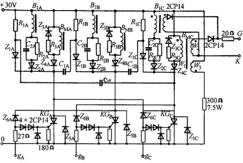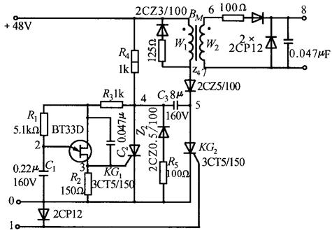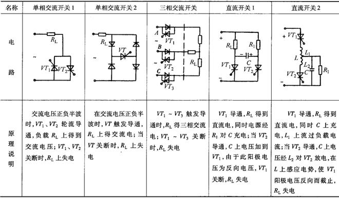 释义 | 晶闸管交直流开关电路 利用晶闸管作交直流无触点开关应用越来越广泛。在各种可编程控制器及各种固态继电器的开关量输入、输出电路中,普遍采用了晶闸管开关电路。 1.单稳态直流开关电路 图8-11所示单稳态直流开关电路的特点是触发功率大,可同时触发多只串并联的可控硅,输出脉冲为宽脉冲,而且宽度可调。 图8-11 单稳态直流开关电路 移相范围:决定于输入脉冲的移相范围。 应用场合:要求大功率脉冲输出场合。 利用小容量可控硅组成开关电路,对输入脉冲进行放大。 2.三稳态开关电路 三稳态开关电路如图8-12所示。 宽脉冲变压器BM的去磁绕组W3仅画了一相,其他二相电路相同。 BM的二次侧绕组W2和尖脉冲变压器二次侧绕组仅画了C相的一组,其他相的电路相同。图中未注参数的元件可查表8-16,三相的相应元件参数相同,如R1A=R1R=R1c=R1。 图8-12 三稳态开关电路 表8-16 图8-12的三稳态开关电路参数 注:三相的相应元件参数相同。即表中C1(A、B、c)即为C1A、C1B、C1c。其余皆同。 三稳态开关电路的特点是输出脉冲功率大,脉冲宽度为120°。附加尖脉冲变压器,脉冲前沿很陡(脉冲波形见图8-13)。 图8-13 三稳态开关电路输出脉冲波形 移相范围:决定于输入脉冲的移相范围。 应用场合:三相大功率可控整流,可控硅元件串并联较多的情况。 3.典型晶闸管交直流开关电路 几种典型的晶闸管交直流开关电路见表8-17。 表8-17 几种典型的晶闸管交直流开关电路 |
