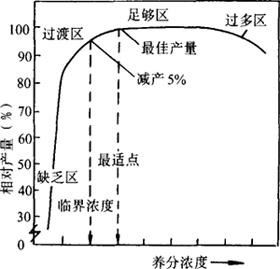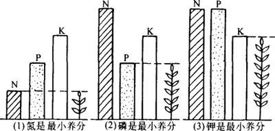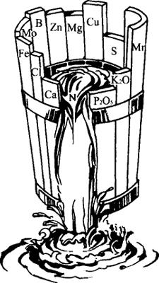 最小养分律在施肥实践中提醒人们应根据土壤有效养分含量和作物需肥特性,首先施用含最小养分的那种肥料,当发生最小养分转变,新的最小养分出现时,施肥目的随之转变到解除新的最小养分限制作用上来。因而在实际施肥过程中,要运行各种肥料的合理配比,使各种养分因子协调平衡以满足作物需要(图4-2)。