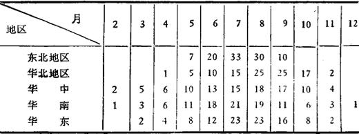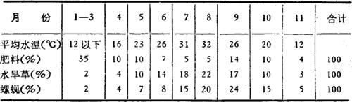 释义 | 月投饵量计算 主要根据天气、水温、鱼类生长和历年经验等情况来制定。以水草和螺蚬天然饵料为主的每月投饵、施肥量比例如表2-76至表2-78。 表2-76 肥料和饵料各月百分比* *据江苏省资料 表2-77 全国各地区全年饵料按月分配比例(%) 注:以鲤鱼为主养鱼精料分配比例。 表2-78 华中农业大学拟定长江流域池塘养鱼全年饵料分配比例(%) |