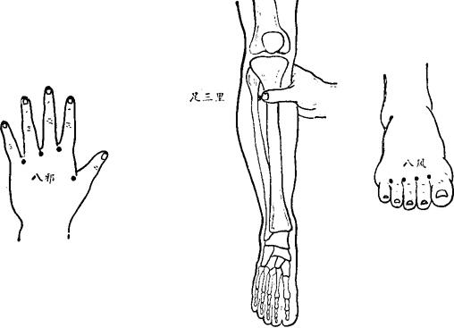 (二)下肢:八风(-)选2穴,足三里(+)。