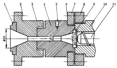 释义 | 机头 图10-2是无分流梭棒材机头的结构图。由于这种棒材机头没有芯棒,没有分流器,所以,机头阻力较小。为了获得密实的实心棒材,必须增加机头压力,使物料进入冷却定径模处的压力在12MPa左右。 由图10-2可知,这种棒材机头设计时的要点如下:①机头平直部分直径较小,使这部分具有阻流阀的作用,增加机头压力,以获得坚实的实心棒材。一般平直部分的直径约为16~25mm,并随棒材直径的增大而增大。平直部分的长度一般为直径的4~10倍,直径大的棒材取小值。②机头进口处的收缩角为30°~60°左右,收缩部分的长度约为50~100mm。③机头出口处的扩张角为45°,以便于塑料棒中心区快速补料。扩张角不能过大,否则会产生死角。出口处的直径约等于定径模的内径,尺寸公差为±0.1mm。④机头内表面应该光滑无死角。 图10-2 无分流梭棒材机头的结构示意图 1-口模 2-与冷却模连接螺钉 3-机头扩大部分 4-机头收缩部分 5-温度计插孔 6一与机头连接螺钉 7-机头法兰 8-机筒法兰 9-过滤板 10-料筒 11-螺杆 图10-3有分流梭棒材机头的结构图。这种机头的特点是:在流道中心设有一个分流梭2,其作用在于减少流道内部容积,并增大塑料熔体的受热面积,有利于停车后重新开车时缩短加热时间,可防止熔料降解。平直部分的口模应光滑,并有一定的长度,有利于棒材外观质量的提高。 图10-3 有分流梭棒材机头的结构图 1-口模 2-分流梭 3-模体 4-支架 5挤出机 6-螺杆 7-多孔板 |