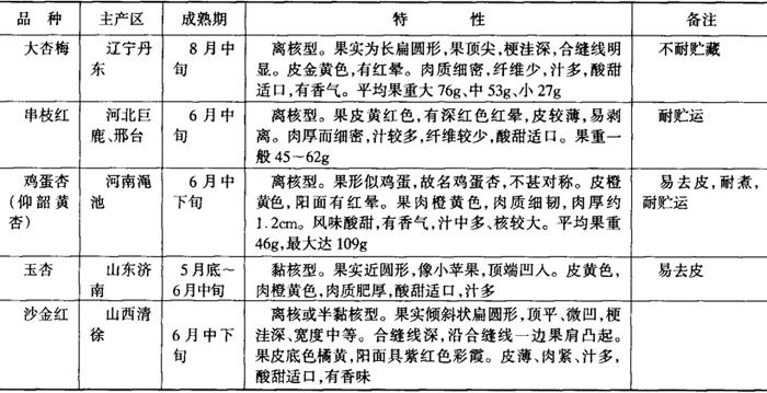 | 释义 | 杏 杏(Aprocot)别名甜梅。杏树为蔷薇科杏属或李属乔木,主要分布大体以秦岭和淮河为界,其中以黄河流域各省为中心地带。杏主产区有辽宁、河北、河南、山东、山西、陕西、甘肃、新疆等。着名品种有兰州大接杏、华县接杏、陕西三原曹杏、辽宁丹东大杏梅、锦州大红杏。河北巨鹿、邢台的串枝红、山西永济红梅杏、新疆库车阿克西米西、山东益都蜜香杏、北京水黄杏、徐州巴斗杏等。杏主要品种参见表1-2-6。 表1-2-6 杏主要品种及其特征