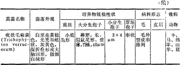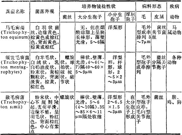 释义 | 束梗孢科 本科中与兽医有关的主要有毛癣菌属(Trichophyton)。 本属目前已发现20几种对人畜的皮肤和毛发有致病作用。 菌落棉絮状,羊毛状,颗粒状或粉末状,或为平秃,光滑和蜡状。表面具沟纹,脑回状,乳头状。色素从白色、奶油色、黄色、棕黄色至淡红色、红色和紫色。小分生孢子侧生,多数散在,单细胞,壁薄透明,类球形,梨形至棍棒形,2~3×3~4μm。大分生孢子棍棒形,两端圆,光滑壁薄,4~8×8~50μm。 1.真菌检查方法 见小孢子菌属。 2.种的特性及鉴别诊断见下表。 有关的真菌培养基有如下几种。 马铃薯葡萄糖琼脂(PDA)的制法如下。 马铃薯 200g(去皮,切碎) 葡萄糖 20g 琼脂 15~20g 去离子水 1000ml 20磅灭菌20min。 蔡氏(Czapek′s)琼脂的制法如下。 硝酸钠 2~3g 氯化钾 0.5g 硫酸镁(MgSO4。7H2O) 0.5g 硫酸亚铁(FeSO4·7H2O) 0.01g 磷酸氢二钾(K2HPO4) 1.0g 琼脂 1.5g 15磅灭菌20min。 麦芽浸汁琼脂的制法是用大麦粉1kg,加水3000ml,保温60℃至液体无淀粉反应为止,过滤,滤液加鸡蛋清(2~3个),搅匀,煮沸,再过滤、滤液加水至10~15波林,加2%琼脂,加压灭菌即成。 沙保劳氏琼脂的制法如下。 葡萄糖(或麦芽糖) 40g 蛋白胨 10g 琼脂 35g 去离子水 1000ml 在高压下溶化,过滤,15磅高压灭菌15min。 11号培养基(培养组织胞浆菌等用)的制法如下。 脑浸汁(牛或羊) 25ml 心浸汁(牛或羊) 25ml 脾浸汁(牛或羊) 25ml 肝浸汁(牛或羊) 25ml 水解乳蛋白 1g 琼脂 1.5g 121℃15min灭菌,冷至45℃,加入血清(牛或羊)达10%。 44号培养基(培养组织胞浆菌等用)的制法如下。 肝浸汁(牛) 33ml 脾浸汁(牛) 33ml 淋巴浸汁(牛) 33ml 胰蛋白胨 1g 琼脂 1.3g 15磅15min灭菌后,加入绵羊血达7%。 观察真菌用的乳酸酚甘油溶液制法如下。 结晶酚 20g 乳酸 20g 甘油 40ml 蒸馏水 20ml |