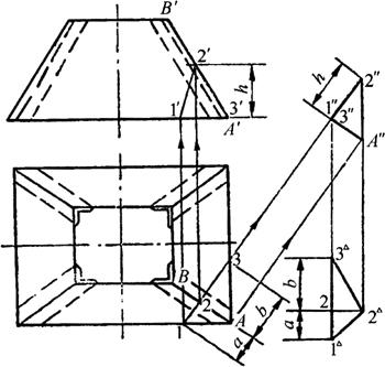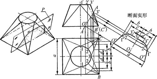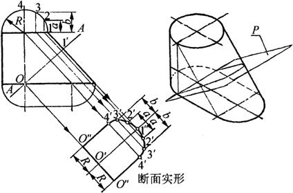释义 | 构件断面实形求法 断面实形图是指截平面沿基本形体轴线垂直或平行截切所获得的图形。在钣金构件制作过程中,断面实形图可反映构件(形体)口端切口实际形状和尺寸,既可确定构件展开长度,又可准确制作构件空间角度的检验样板。因此,准确求取构件的断面实形是展开下料的关键依据。 (一)断面实形图的求法步骤 由于构件形状和截取位置不同,断面实形的求法也不相同,但主要是利用变换投影面法,具体步骤如下: (1)画出构件的主视图、俯视图或有关视图。 (2)画出截交线的两面投影。 (3)用变换投影面法求实形:求实形时,根据截平面所处位置,有如下四种情况: 1)截平面为水平时,截交线的水平投影反映实形,不必另求。 2)截平面为铅垂面时,用旋转法或变换投影面法求断面实形。 3)截平面为正垂面或侧垂面时,须画出左视图,用变换投影面法求实形。 4)截平面为一般位置平面时,须将截平面在视图中变换成垂直的投影面,再进行二次变换投影,即可求出断面实形。 (二)平面立体断面实形求法 1.棱体类断面实形 图6-10a为正垂面P斜切正四棱锥,I-I为剖切迹线,1′-3′为截交线的正面投影,截交线的水平投影为一四边形。求其实形的步骤如下: 图6-10 棱体类断面实形求法 a.四棱锥断面实形 b.六棱柱断面实形 (1)用已知尺寸画出主视图、俯视图,在主视图连接迹线I-I上得1′、2′(4′)、3′点,由2′向右引水平线至O′B′线,其距离长用a表示。 (2)由主视图上1′、2′(4′)、3′各点作1′-3′的左上垂线和平行线1″-3″,以1″-3″为基线,以俯视图上截平面顶点2、4(1、3点重合在AB轴线上)至AB的距离a为长,在各垂线上对应截取后得2″、4″点。 (3)连接各点所得1″-2″-3″-4″-1″四边形即为所求断面实形。 图6-10b表示正垂面P过上端斜切六棱柱后A-A断面实形为六边形,其作图求法阅图便知。 2.矩形锥筒内加强角钢的断面实形 图6-11所示矩形锥筒内焊有四个角钢,内衬角以加固连接。为求角钢实际应劈开的角度,须求出与锥筒两侧面垂直的断面实形,这便是工程中常遇到的两面角问题。求两面角断面角度实形的步骤如下: 图6-11 矩形锥筒内加强角钢断面角度实形 (1)分析所求实形的断面应与锥筒侧面交线垂直,而交线即为所求平面(相当于一新投影面)的垂直线,且为一般位置线,须经二次变换投影面,变一般位置线为投影面垂直线。本例须经第一次变换使一般位置线变为投影面平行线,第二次变换再使投影面平行线变为投影面垂直线。 (2)用已知尺寸画出主视图和俯视图,为确定出切点的两面投影,由俯视图AB线上任意点2引AB线的垂线,与底断面两边相交1、3点;由1、2、3点引投影连线得其正面投影1′、2′、3′,且2′点至底边的高度为h。 (3)第一次变换投影面。在适当位置设置新投影轴与AB平行,并求出各点在新投影面上的投影1″(3″)、2″、A″,连接各点所成的三角形平面中2″-A″为投影面平行线,也是锥筒两侧交线的实长。 (4)第二次变换投影面,设新投影轴垂直于2″-A″,并求出各点的新投影1△、2△(A△)、3△点。此时,2△-A△线投影为一个点,锥筒两侧面(部分)分别为2△-3△和2△-1△线,二者所求的夹角即为锥筒内侧角钢应劈开的实形角度。 (三)平曲面立体的断面实形求法 1.过渡连接管断面实形的求法 图6-12所示的顶圆底细长圆过渡连接管是由曲面和平面组成,其中左侧面是半径为R的1/2圆管,中间为三角形平面,右下面为1/2椭圆管。作这类连接管的展开时,一般需要用换面法求出椭圆管部分的断面实形,用以确定展开长度。具体作法如下: 图6-12 过渡连接管断面的实形 (1)用已知尺寸画出主视图和顶底1/2断面图,由O点画剖切迹线AA过底断面左半圆中心垂直于右轮廓线,并交于1′点。 (2)三等分顶断面1/4圆周,等分点为1、2、3、4。由等分点引下垂线,得与顶口线交点。再由各交点分别引与右边线平行线并延长至主视图外边,得与O′-1″交点(O′-1″//O-1′)。 (3)以O′-1″为基线,以顶断面上各等分点至顶口线的距离a、b、R为长,在各平行线上左右对称截取得出2′、3′、4′各点。 (4)以直线和曲线顺次连接各点即得椭圆管部分(即所求A-A)的断面实形。 2.顶圆底方连接管断面实形求法 如图6-13表示正垂面P斜切顶圆底方连接管,主视图A-A为剖切迹线,O°-3°为截交线的正面投影。具体步骤如下: 图6-13 顶圆底方连接管断面实形 (1)用已知尺寸画出主视图和俯视图,在主视图上连接迹线A-A得O°、3°两点。 (2)四等分俯视图半圆周,等分点为1、2、3、2、1。连接各等分点与B、C,并画出各线的正面投影B′(C′)-1′、B′-2′、B′-3′得与O°-3°交点。由O°-3°交点引下垂线,得与俯视图各线对应交点,顺次连接各点成直线和曲线即为截交线的水平投影。 (3)在主视图的右下方作O°-3°的平行线O-3,并从O°-3°线上各点向右下作O-3的垂线得各交点。以O-3为基线,在各垂线上左右对称截取俯视图上a、b、c、d得O″、1″、2″、3″、3″、2″、1″、O″,以直线和曲线顺次连接各点,即得A-A断面实形。 |