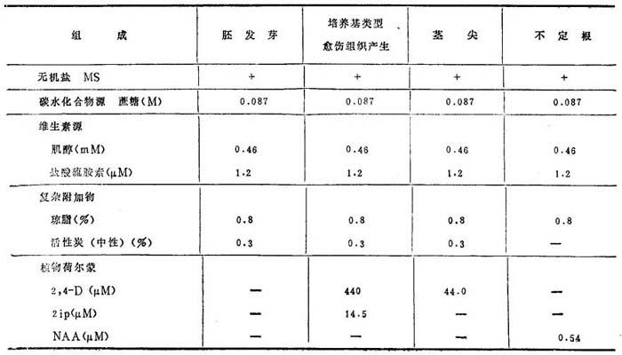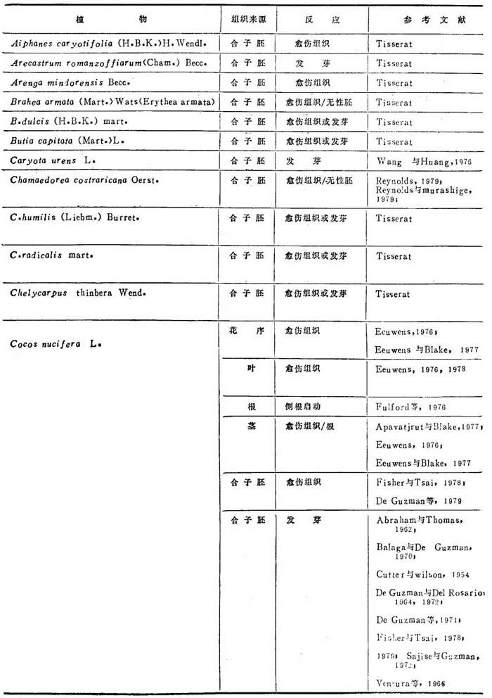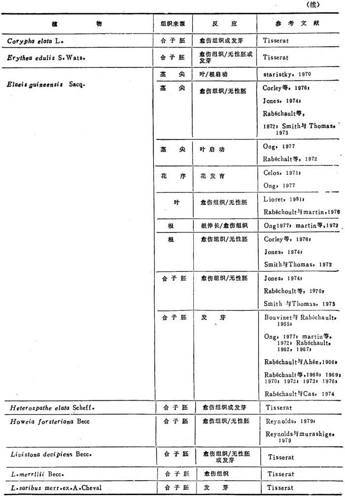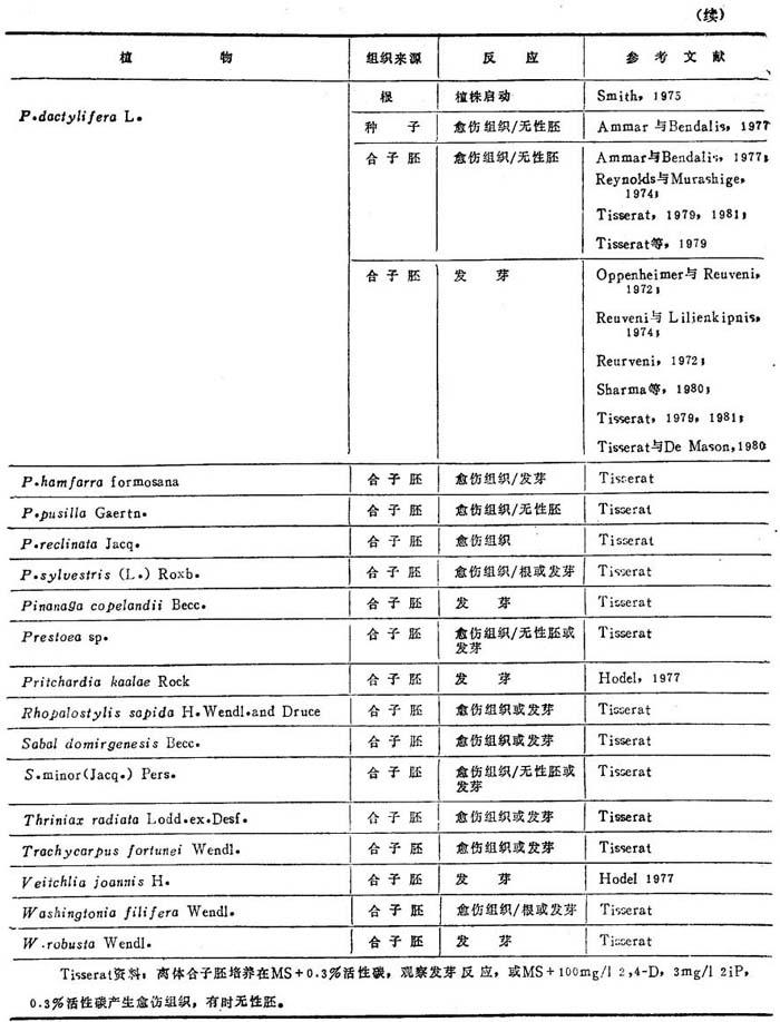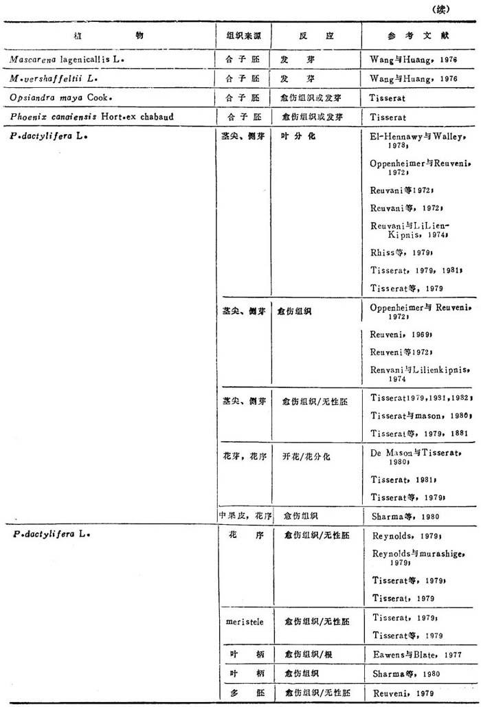 释义 | 枣椰树 枣椰树属棕榈科(Arecaceae)含有200余属2500余种。如枣(Phoenix dactylifera L.),椰子(Cocos nucifera L.)和油棕(Elaesis quineensis Jacq.)是广泛栽培的果树作物产物。是木本单子叶植物。现今利用作为食糖、纤维、燃料、木材、建筑材料、观赏、蜡、药物、造纸、糖、酿酒、染料和植物油。 (一)组织培养技术改良棕榈树 棕榈遗传和育种适用胚培养以加速胚发芽,得以更快地评价其幼苗子代,也可用异种或异属杂种发芽,这在自然界不能生存。 组织培养技术可在无菌条件下研究棕榈病害病原菌与寄主关系。也是研究其形态建成和生理学的模式材料。用克隆的再生植株可进棕榈群体的理想的检测:生长调节剂效应和环境刺激对其生长影响。改变营养培养基成分和物理环境,可阐明其开花和吸枝的机理。 (二)研究进展 Cwtter与Wilson(1954)首次将离体可可胚生长在改进White培养基+CW。自后,胚培养广泛应用于可可、油棕、和枣榈。 表25-9汇综了1970年来棕榈组织培养研究。现已40种代表29属的外植体产生愈伤组织。初步鉴别出11种无性胚和胚状结构的启动。只有2种从无性胚形成独立生活的棕榈:油棕和枣榈。4种从离体胚培养发育成植株。只有油棕和枣榈从茎尖经发生不定根长成完整再生植株。 表25-9 乔木单子叶种的组织培养 由此可知棕榈的多种外植体曾产生愈伤组织。但是,一般仅有更接近分生组织外植体产生的愈伤组织,有形成无性胚能力。从合子胚、侧芽、茎尖、未成熟花序取得了胚胎发生的棕榈愈伤组织。其性质高度异质性,非同步发育胚围以非分裂附属组织。油棕早期体细胞胚在前胚期突出状态是梨形白球状结构,呈有明显的外形。这些无性胚与合子胚一样含有储藏蛋白质和脂质体。经伸长和分裂,变成极化和发芽。枣榈或从单细胞产生的分生组织簇,埋在愈伤组织内,分裂形成分生组织位点,当转移到低生长素培养基后,也极化。 有意义的,无性胚吸盘退化,对发育中胚状体不发生从培养基吸取营养作用。合子胚和无性胚胎发生的胚柄表现平行发育形成幼苗。椰子从体细胞组织产生的愈伤组织与油棕和枣榈的不同,是非胚胎发生的,由有规则排列的细胞组成,顶端是松散链。但是,最近报道从椰子离体胚产生胚胎发生愈伤组织。 棕榈胚培养,大都栽培种在第1周内启动发芽。胚增大,产生初生根系,培养4-8周后,出现第一叶。油棕胚培养发芽要较长时间。象无性胚一样,子叶吸盘退化,离体合子胚里,无胚乳。培养游离胚切段研究油棕发芽中游离胚部分的发育和早期器官发生和不同器官间互作。 枣榈游离茎尖和分生组织尖用以再培养在含0.54μM NAA营养培养基上,促进不定根产生。也曾启动若干格外腋芽。培养的芽增大,接种2周内,表现格外叶的发生。8周后,许多绿色光合叶占优势。带根枣榈尖移栽成功。 枣榈和油棕的完整未成熟花序芽和成熟与未成熟个体花离体培养建立。营养培养基加NAA,枣榈花序和单独花芽开花;有时雄花芽从明显退化假果皮伸出。离体培养的花芽,变绿、增大,形态建成,但仍保留它的短暂生命,很少见在培养中能生存几周或几月。 (三)培养成功的关键因子 棕榈组织培养必需满足:(1)外植体生存和生长所必需的基础营养,(2)外植体和培养基褐化最低。 1.培养基组成 (1)基础培养基成分 Eeuwens(1976)试验了WH,Heller′s,MS和Y3培养基,保持碳水化合物,有机成分和荷尔蒙附加物为常数,对叶柄、茎和花序的反应。MS和Y3无机盐类(高氮)愈伤组织生长最好。反之,NO3-N和NH4-N低的WH和Heller′s愈伤组织生长明显较差。碘加强体细胞椰子外植体愈伤组织产生。同样,Miniano与De Guzman(1978)发现椰子胚在WH液基加MgCl2或KCl生长较好。 若干学者采用改进WH盐类加CW,生长素和细胞分裂素离体培养椰子发芽。Schroeder(1970)用改进WH加IAA和KIN培养枣榈组织。Ammar与Benbadia(1977)用Knob培养基培养枣榈种子发芽。 MS+生长素(2,4-D或NAA)适于枣榈体细胞外植体组织取得愈伤组织。Heller′s+CW,2,4-D和KIN从油棕胚产生胚胎发生胚。Reynolds与Murashige(1979),Tisse-rat(1979)用改进的MS+活性碳,增高生长素水平到0.05-0.5mM,产生了大量枣榈愈伤组织。Reuvani(1979)主张用 Tisserat(1979)报道碳水化合物源对离体枣榈茎尖生存的重要性。无论无机盐类,维生素和荷尔蒙如何,枣榈在3%蔗糖营养培养基上能生存和生长。但前者是离体培养完成分化所必需。 (2)复杂附加成分 5-20%CW促进椰子胚发芽(Abraham与Thomas 1962,等等)。Wang与Huang(1976)用培养基加15%CW,0.5%ME和0.05或0.3%活性碳,使Mascarena lagenicaulis L.,M.vershaffletii L.,和Caryata urens L.离体胚发芽。但是,枣榈胚发芽不需CW(Reuveni与Lilien-Kipnis,1969)。Tisserat用改进MS+0.3%活性碳不加荷尔蒙或CW几种棕榈种离体胚能以发芽。Hodel(1977)用简单规定培养基使Pritchardia Kaalae Rock和Veitchia joannis H.Wendl.离体胚发芽。椰子和油棕游离胚的充分发芽,需要特定培养基和处理。Fisher与Tsai(1978)发现椰子胚在改进液基MS加57.0μM IAA,98.0μM IBA,22.0μM BA,20%CW和12.5-25.0μM 2iP发芽最好,移至琼脂培养基促进生根。Robéchault等(1967,1968,1969)仔细研究油棕胚离体培养发芽和培养。除营养成分外,胚发芽受种子含水量,种子储藏时间大的影响,和种子休眠与含水量的关系。 营养培养基加CW,曾取得体细胞外植体产生愈伤组织。但在各种化学规定培养基不加任何复杂附加物,也曾取得棕榈外植体组织的滋生愈伤组织。 (3)其它培养