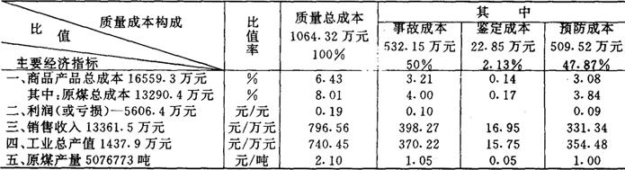 释义 | 某矿务局煤炭质量成本核算与管理 质量成本,是企业全面质量管理活动的经济表现。对质量成本进行统计、核算、分析、报告和控制,不但可以挖掘企业的潜力,找到降低成本的途径,促进企业经济效益的提高,而且可以指导和监督质量管理工作的开展,实现以控制论为理论依据的目标成本管理。 质量成本是一种专项成本,它是企业为保证和提高商品产品质量而发生的一切费用和商品产品达不到既定的质量标准(水平)而发生的一切经济损失的总和。从煤炭工业的实际情况来讲,质量成本主要包括:事故(故障)成本、鉴定(鉴别)成本和预防成本等。事故成本又分为内部和外部事故成本两部分。 一、1994年度质量成本的基本情况 这个局1994年度亏损5606.4万元,商品产品总成本16559.3万元,其中,原煤总成本13290.4万元,销售收入13361.5万元,工业总产值14373.9万元,原煤产量5076773吨。由于现行的规定与核算理论不统一,有些属质量成本的项目未计入成本,但最终反映到了企业亏损总额内,因此,仍按应列项目分析。 全局全年构成质量成本的主要内容有: 1.事故成本。这里指的是内部事故成本,即商品产品在出厂前的全部生产过程中,因发生事故所造成的损失和处理这些事故所支出的一切费用,主要包括: (1)人身事故损失。由于人身事故,1984年实际支付遗属抚恤费56.07万元,因工残废抚恤费9.7万元,工伤救济费67.77万元,因工残废补助费14.8万元,硅肺补助费28.67万元,工伤住院生活补助费10.3万元,全年工伤休工工资169.76万元。共计357.07万元。 (2)机械事故损失。1984年的实际成本费用,由于机械事故而影响成本增加95.94万元,修复损坏的电机,需支付8.35万元,共计104.29万元。 (3)事故分析处理费。人身和机械事故的分析处理费,全年约计支付1万元。 (4)产品质量降低损失。由于煤类产品达不到规定的等级,而发生煤质罚款40.63万元。 (5)废品损失。据调查典型推算,全年无效进尺1834米,损失20.55万元。局机电修配厂实际造成废品损失6.91万元。共计27.46万元。 (6)材料盘亏损失。全局全年材料盘亏1.7万元。另外,还有报废的1980年以前的机电产品损失,在待处理流动资金损失内挂帐35.4万元,共计37.1万元 以上6项内部事故损失,总计532.15万元。 商品产品销售业务发生后,用户在检查验收和使用过程中,发现由于质量和计量等问题,供需双方发生经济纠纷,应由供方负担的索赔费、退货损失、保修损失和折价损失等,为外部事故损失。补赔商品煤量,抵赔需方的索赔费等也应按实际的售价计算在此项内。该局由于事先工作做得好,各类经济纠纷处理得当,1984未发生外部事故损失。 2.鉴定成本。为了掌握、促进和确保从材料进货到材料的投入使用以及产品出厂前的化验检验,所耗费的一切费用为鉴定成本。主要包括: (1)检查验收费。全局全年各类材料、配件和设备等的进货检查验收费,约占仓库经费的30%,据此推算1984年共支出检查验收费4.3万元。 (2)产品化验检验费。全局煤类产品采制化人员95人,每年工资奖金计10.3万元,另加材料、药品、仪表购置,修理费和劳动保护用品等1.4万元,固定资产折旧费1万元,还有火工产品、水泥和钢材、钢水化验等约支出3万元。共计15.7万元。 (3)产品的破坏性实试损失。为了确保商品的质量,火工产品必须按部规定比例数,抽样进行破坏性实验,损失计2.65万元。 以上三项鉴定成本费用共22.65万元。 3.预防成本。为了防止事故的发生,防止产品质量水平的下降,或进一步提高产品质量,而采取的各种措施所消耗的费用,为预防成本。主要包括: (1)劳动保护费。包括发放给职工的劳动保护用品和劳动保护费(含保健费),全局共支出323.55万元。 (2)电气设备试验费。为保证电气设备的安全正常运行,必须进行定期的检验、试验和校验,仅局电气试验室,每年工资奖金等支出1.37万元,材料消耗、仪表检修、校验和更新2.3万元,房屋设备折旧费1万元。共计4.67万元。 (3)消防、救护、警卫经费。为搞好矿区的防火、防盗、社会治安和矿山救护工作,必须设置消、救、警人员和机构。全局每年支出消救警经费64.29万元。 (4)安全措施费。为搞好矿井的安全生产,搞好防火、防尘、防瓦斯等工作,全局全年共支出安全措施费117.01万元。 (5)保险费。按照国家保险法,矿区的固定资产和流动资金必须进行投保,虽然根据上级指示,煤矿企业暂缓投保,但今后将难免此项开支。 以上五项预防成本,共计509.49万元。 由于井巷掘进是煤炭工业生产的一项主要生产过程,因此,该过程中所耗用的支护材料,虽然在一定程度上也属于预防性的,但它主要还是为采煤过程创造工作条件,所以未将其列入预防成本项目内。 综上所述,该局,1994年度商品产品的质量成本总额为1064.32万元。其中,事故成本占50%,鉴定成本占2.13%,预防成本占47.87%。各项质量成本与有关经济指标的比值如299页表(1)所示。 表1 质量成本比例值表 二、质量成本的核算、管理与分析 目前,正值经济体制改革时期,企业正由生产型向开拓经营型过渡。但是怎样正确认识质量成本在企业管理中的作用,怎样运用质量成本的科学理论指导和提高企业管理水平,向定额成本和目标成本管理迈进,还需做许多工作。 要正确运用质量成本的资料来指导和改善经营管理,必须做好质量成本资料的整理、分析、汇集和核算。从目前煤炭企业的管理现状出发,各企业基本
