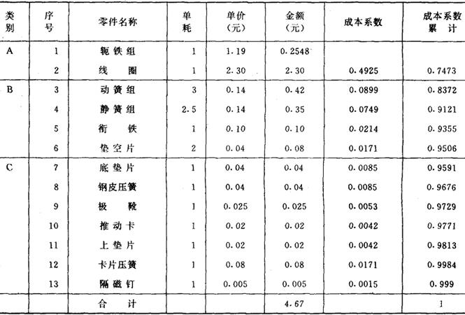 释义 | 某继电器厂对XX型继电器的价值分析 某继电器厂对X型继电器进行价值分析的方法如下: 一、选择价值分析对象 他们从1980年投产的14个产品品种中,选择了X型继电器作为价值分析的对象,原因是: (1)该产品是该厂的主产品,占全年总产量的96%; (2)该产品利润率低,1980年销售利润率只有5.4%; (3)该产品市场需要量大,生产厂多,竞争激烈; (4)急需扩大用户,提高市场占有率。 二、收集资料 在开展价值工程的过程中,他们收集了下列资料:产品全套技术文件;工厂历年生产资料和历史销售情况;市场需要及资源动态;关于成本的各项费用和零件计划单价(包括工时定额);有关材料的消耗定额、利用率以及材料来源;用户对产品质量、成本、销售价的要求和意见;工厂今后的生产发展计划和销售预测;国内同行业的有关技术经济指标。 三、功能分析 首先,采用ABC分类法,根据成本情况,将继电器的17种44个零(部)件进行分类,选出13种零件作为分析对象。 其次,根据13种零件在整个继电器中所起的功能,用“强制打分法”进行打分。打分由对继电器情况熟悉的有关同志进行,并以各人打分的平均值作为该零件的最终功能得分。然后将每个零件的得分除以13个零件的总分,求得各零件的功能系数,如表1。 表1 再次,对13个零件的成本进行详细分析,求得每个零件的成本系数。成本系数为每个零件的成本除以13个零件的成本之和。其值列于表2中。 表2 最后,根据功能系数和成本系数求出价值系数: 价值系数如表3所示: 表3 同时,画出价值系数图如下图所示。由图可确定“线圈”及“轭铁组”这两个零(部)件是价值分析的重点对象。 四、分析研究,提出改进方案 (1)轭铁组 轭铁组的功能是固定零件,构成磁路,据此进行分析,发现五个零件一个也不能减少,所以只能改进材料和工艺。如将材料改用优质板,可减少废品5%,热处理减少一次,装配调试工效可提高20%,经核算每只继电器可降低成本0.09元。又轭铁组原采用纯镍板镀镍,现改用“电解镍”,质量不变,每只继电器成本可节省0.13元。改进生产工艺,用专机生产,每只可降低0.18元。这样,每只轭铁组共节省成本0.39元。 (2)线圈 线圈也由五个零件组成,功能是接受信号和输出信号。根据用户要求,改变焊片,专机生产,使断线率由5%降到1%,每只继电器降低成本0.06元;线圈原用QZ漆包线,在性能满足的条件下改用QA漆包线,每只继电器降低成本0.18元;线圈骨架原用ABS塑料,现改用增强聚丙烯,可节省0.09元。这样,每只继电器可降低成本0.33元。 仅这两个零件的改进,每只继电器就能多增利润0.72元,全年50万只产量,即可净增利润36万元。 五、实施评价 至1981年6月底,上述改进除优质板因分配途径关系,尚未全部更换,QA-1漆包线只改用大部分,骨架自制仅占50%还要增加生产能力外,其它均已实现。经济效益也很明显。1981年1~6月,利润完成了年计划的62.56%,比1980年同期增长71%;可比产品成本下降9.6%;JR-14继电器成本降至5.31元/只,比1980年降低0.60元/只;流动资金周转天数由1980年的236天降为146天。全年预计增加36万元利润的目标是能够实现的。 |