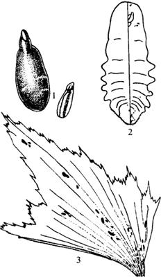 释义 | 柑橘并盾蚧 【学名】 Pinnaspis aspidistrae Sign。 【别名】 苏铁褐点盾蚧、蜘蛛抱蛋并盾蚧。 【分布与为害】 在上海、山东、辽宁、湖北、江苏、浙江、广东等地均有分布。寄主有建兰、棕竹、鱼尾葵、麦冬、山茶、万年青、苏铁、棕榈、木槿、柑橘、蜘蛛抱蛋等。若虫与雌成虫刺吸叶片汁液,造成叶片枯黄。 【形态特征】 雌成虫介壳前端尖狭后端宽圆,有弯曲,褐色,长2.0~ 2.8毫米,宽1~1.5毫米。壳点2个,淡黄色,在前端。雄介壳白色或淡黄色,蜡质,狭长,两侧几乎平行。介壳长0.8~1.0毫米,背面有3条纵脊线。壳点位于前端(图731)。雌成虫体细长,淡黄色,长1.3~2.2毫米,宽0.5~1.4毫米。头、胸部很长,占体长的一半,边缘光滑完整,分节明显,后胸和腹侧缘突出成显着的瓣状。1龄若虫体圆形,鲜黄色,长0.3毫米。触角粗长,5节。2龄若虫长卵形,鲜黄色,长0.6毫米。 图7-31 柑橘并盾蚧 1.雌雄介壳 2.雌成虫 3.被害状 【生活习性】 1年发生2代。以受精雌成虫越冬。次年春季产卵。卵产于雌虫蚧壳下。孵化的若虫爬到枝叶上为害。第一代成虫7~8月发生,第二代成虫在10月间出现。 【防治方法】 虫数少时,用竹片刮除。在若虫孵化期喷施40%氧化乐果1000倍液或40.7%乐斯本乳油1500倍液。 |