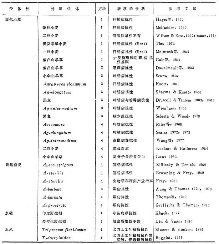 释义 | 染色体操作和外源基因转移 关于了解基因组关系和遗传控制染色体配对有长足进展。运用非整倍体分析,染色体分带技术,同工酶分析和就地DNA杂交,表明外源遗传物质特性。珍珠粟和水稻原生质体培养和再生植株已成功。建立了渗入完整外源基因组,单个染色体、染色体小片段或极少数外源基因从野生种导入栽培种的技术。选择用于转移外源基因的适宜材料,有赖于基因组关系、种间杂种的染色体配对程度和重组,采用了直接杂交和与栽培亲本回交。有些抗病外源基因曾从野生种转给了小麦、燕麦、玉米和水稻栽培品种。例如草丛抗性基因从Oryza nivara经回交转给了栽培稻。增高生物学产量和籽实产量基因从野生种转给了燕麦、高粱和珍珠粟栽培品种(Frey1983)。当野生和栽培种染色体不配对时,通过常规重组过程转移基因难于成功,可利用某种染色体操作,以取得基因转移。 (一)染色体工程 1.合成双二倍体 双二倍体合成是结合外源和栽培种基因组的重要方法。远缘杂种常有高度不育性。采用不育杂种染色体加倍和产生双二倍体可恢复可育性。45年来,尤其发现秋水仙素后,已取得一些栽培种与有关野生种杂种的双二倍体。除小黑麦外,无一成为新作物的。 这类双二倍体缺乏基因组协调性,减数分裂不稳定和其它不需要状态,这是核-质互作结果。但它们在取得需要衍生体有重要性,如小黑麦。 2.选取多倍体 由于完整外源基因组渗入,可能会带来不需要特性,有些通过双二倍体可能取得稳定多倍体衍生体。小黑麦是选取多倍体的有益经典例证。分别从六倍体小麦-黑麦和四倍体小麦-黑麦杂交曾产生了二类小黑麦:八倍体(2n=8X=56 AABBDDRR)和六倍体(2n=6X=42AABBRR)。八倍体小黑麦由于广泛的减数分裂干扰结果,育性降低和低产,不能用于生产(最近鲍文奎已育成八倍体小黑麦品种——编者注)。另一方面,六倍体小黑麦的减数分裂稳定性和种子产量较高,而仍非理想商品生产品种。Gupta等(1982)已取得显着进展,并育成品种用于生产。从(1)八倍体小黑麦×六倍体小黑麦和(2)六倍体小麦×六倍体小黑麦杂种后代选出的六倍体小黑麦要好得很多。它们的减数分裂稳定性、籽实产量和品质比原来的小黑麦为优越。这种优越性可能由于小麦A与B基因组重组和黑麦基因组一些染色体置换面包小麦D基因组染色体。Gupta(1984)指出29/41小黑麦推广品种有R/D染色体置换。 3.外源添加系 O′mata(1940)描述从供体种的个别染色体添加到受体种的方法。用以克服完整基因组的问题。其法包括二种间杂交,杂种回交或受体种双倍性化,从回交后代选择添加系。取得了具有山羊麦属,冰草属,Haynaldia,黑麦和大麦单加染色体对的小麦。从A.strigosa,A.hirtula和A.barbata单个染色体对添加到栽培燕麦,取得燕麦添加系。从玉米复隐性测交母系杂交产生了玉米-Tripsacum单体添加系。可是,由于外源染色体添加系的外源染色体不稳定性和外源染色体带来的不需要性状的渗入,尚未能成为普遍商品品种。 4.外源置换系 外源染色体置换指栽培亲本的一对或几对染色体为外源种的相等对数所置换。禾谷类置换系研究以小麦为主,其次燕麦、玉米、大麦、水稻,珍珠粟和高粱尚未见报道。为了培育成品种,必需具备:(1)外源染色体必需与受体缺失的染色体相补偿;(2)必需与受体种基因组相整合,而不破坏减数分裂稳定性,可育性,和籽粒产量和质量特性;和(3)对受体种提供某种格外优点。 山羊麦属、黑麦和冰草属外源染色体曾换入小麦。Shepard等(1981)大麦染色体6为小麦6A,6B和6D所置换,育成小麦系,大麦4置换小麦4A育成另一些系。大麦b与小麦b遗传补偿性极好,但大麦4置换的结果不一致。燕麦取得了A.barbata外源染色体的置换系。许多情况下,外源染色体不能完全补偿缺失染色体,有时与需要基因同时带有非需要基因。德国和东欧育成的一些栽培品种是自发置换体,如黑麦1R置换小麦1R,CIMMYT育成若干栽培品种,其中有小麦1B片段为黑麦1R片段所置换,具有广泛适应性和Septoria tritici抗性。 5.诱导部分同源配对 小麦A、B、D基因组间无染色体配对。这种配对为ph(配对部分同源)位点的控制。操作这个位点,能诱导产生部分同源配对和小麦与其它外源种染色体重组。小麦还有其它配对调节者。诱导外源染色体与其小麦部分同源体配对和交换,为外源遗传变异渗入栽培小麦提供独特机会。兹举三种方法如下。 (1)采用野生种以诱导部分同源配对野生种Aegilops speltoides和Avena longiglumis Cw57已知能分别诱导小麦和燕麦部分同源配对,并诱导部分同源重组成功。Riley等(1968)用Aegilops comosa具有格外染色体对(2M)添加系,从Ae.comosa把锈病抗性转移给小麦。这种二体添加系(2n=44)×Ae.speltoides(2n=14),杂种染色体29,Ae.comosa 2M染色体与小麦2D配对,这是由于ph活性的抑制结果。因为Ae.speltoides的显性等位基因抵消了ph效果。选出了具有Ae.comosa锈病抗性的小麦品系,叫“Compair”。 六倍体燕麦的遗传控制的二倍体配对,也能被二倍体种A.longiglumis(Cw57)所抑制,可与小麦中的Ae.speltoides相比较。前者具有基因(一个或更多)抵消着A.sativa控制抑制部分同源配对的基因作用。曾用A.longiglumis成功地把粉霉病抗性从A.barbata转给燕麦。 A.barbata端着丝点添加系×A.longiglumis与燕麦的八倍体双倍体取得成功。与燕麦回交以取得外源基因转移。衍生系无有端着丝点染色体,提供证据,通
