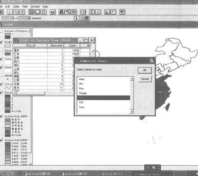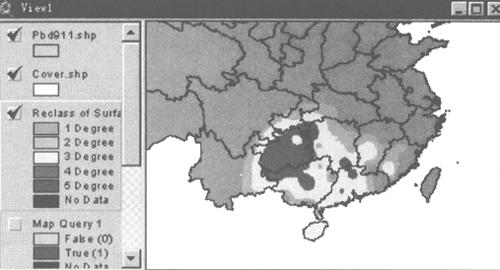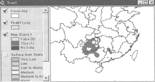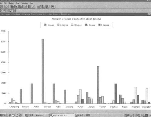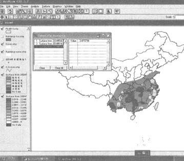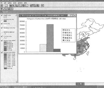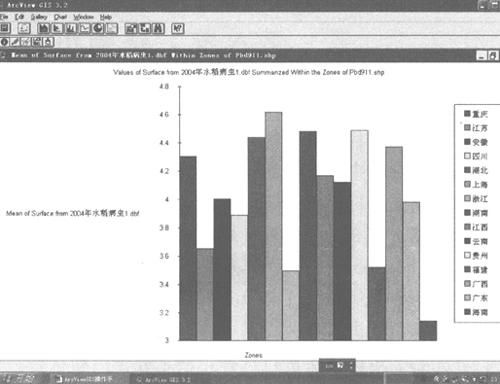释义 | 查询面状分布图的信息并以图形方式表示 虽然病虫面状分布图属栅格(Grid)类型,没有对应的属性表,但利用地图查询(Map Query)、区域汇总(Summarize Zone)、区域柱状图(Histogram by Zone)、区域表格(Tabulate Areas)、地图计算(Map Calculator)等空间分析功能可获得病虫相关的分布信息,并以图形方式表示。这里仅介绍一些常用的查询功能。 1 获取病虫面状分布图自身图形化信息 1.1 利用鉴别工具(Identify tool)查询 通过点击视图窗口图层目录列表中病虫面状分布图的名称使其处于活动状态。从界面上选择鉴别工具按钮 图11-52 示鉴别工具查询病虫面状分布图信息 1.2 利用柱状图(Histogram)查询 使病虫面状分布图Theme处于活动状态,点击界面上柱状图工具按钮 图11-53 示柱状图工具查询病虫面状分布图信息 如从图11-53可以看出,稻飞虱大部中等以上程度发生,其中偏重发生面积最大,中等发生次之,大发生也有一定的比例。 1.3 利用地图查询(Map Query)功能查询 如图11-54所示,通过空间插值绘制了观测区稻飞虱虫口密度分布平面图,现在需要找出虫口密度在2000~3000头/百丛的区域,利用地图查询功能可以很方便地解决类似问题。 选择病虫面状分布图“Surface from Station.dbf”,从界面分析(Analysis)下拉菜单选择地图查询(Map Query)选项,在随之出现的对话框中建立表达式:[[Surface from Station.dbf]>2000]and[[Surface from Station.dbf]<3000],点击计算(Evaluate)键,ArcView GIS将生成一个名为Map Query1图层,并添加到视图窗口的图层目录列表中。关闭Surface from Station.dbf,打开新生成的图层,视图窗口将显示出满足给定条件的区域,见图11-54。 图11-54 示地图查询(Map Query)功能查询病虫信息 1.4 利用重新划分等级(Reclassify)功能查询 假设要将已绘制好的稻飞虱观测区虫口密度分布图根据密度的大小划分成5个不同的级别。一级百丛虫口密度小于500头,标注为1 Degree,在地图上以绿色显示其分布区域;二级为500~1000头,标注为2 Degree,以浅蓝色显示其分布区域;三级为1000~2000头,标注为3 Degree,以黄色显示其分布区域;四级为2000~4000头,标注为4 Degree,以粉红色显示其分布区域;五级为4000~6000头,标注为5 Degree,以红色显示其分布区域。运用重新划分等级功能可非常方便地绘制出新的满足要求的分布图。 选择图层Surface from Station.dbf使之处于活动状态,从界面分析(Analysis)下拉菜单选择重新划分等级(Reclassify)功能,在出现的分级(Classification)对话框级数(Number of Classes)下拉菜单栏选择5并点击确认键,屏幕将出现重新定义分类数值(Reclassify Values)对话框,在新的数值(New Values)栏依次填写所需划分的5个级别的数值范围,填写完毕点击确认键,一个按照给定划分等级名称为Reclass of Surface from Station.dbf的图层被添加到视图窗口的图层目录列表中。双击其名称打开图例编辑器,改变其填充颜色和标注,并使其显示在视图窗口,通过调整图层目录列表顺序,来调整各层在视图窗口的摆放层次,即可得出满足条件的新的病虫面状分布图(图11-55),较为清晰地显示了各地发生程度。 图11-55 示重新划分等级功能查询病虫分布信息 需要注意的是:要在某一病虫面状分布图中查询信息,首先必须对之进行选择,使其处于活动状态,否则操作无法进行。 2 借助其他图层获取病虫分布的有关图形信息 2.1 利用区域统计(Zonal Statistic)功能获取病虫分布信息 例如,已经绘制的2004年稻飞虱发生趋势分布图,想知道各省的发生程度的平均值情况,则可以借助于省界数字化地图,利用ArcView GIS空间分析模块提供的区域统计(Zonal Statistic)功能进行相关处理将之算出并以柱状图表示。 在视图窗口选择省界数字化地图Pbd911.shp,打开其属性表并选择所要了解省份的纪录,点击回到视图窗口,从界面分析(Analysis)下拉菜单选择区域统计(Zonal Statistic)命令,在出现的区域汇总(Summarize Zones)对话框中选择用于定义区域名称的字段(一般选择包含地名的字段,如包含省名的Prov_ch),点击确认键后再在对话框图层列表选择所需要的含有汇总所用变量的病虫面状分布图,如“Surface from 2004年水稻病虫1.dbf”,屏幕上将出现一个名称为“Stats of Surface from 2004年水稻病虫1.dbf Within Zones of Pbd911.shp”的汇总表和制作柱状图统计量选择(Select statistic to chart)的区域汇总对话框,见图11-56。 图11-56 示区域统计生成的表格和区域汇总对话框 在对话框中选择平均值(Mean)作为制作柱状图的统计量,点击确认键,一个名为“Mean of Surface from2004年水稻病虫1.dbf Summarized Within Zones of Pbd911.shp”的窗口出现在屏幕上,其内显示了选择省份稻飞虱平均发生级别的柱状图,见图11-57。通过该柱状图,可以看出各省的发生级别。如要了解汇总(Sum)、最大值(Max)、最小值(Min)、标准差(Std)、范围(Range)等信息,选择相关制作柱状图的统计量,即可得到相应的柱状图。 图11-57 示运用区域统计功能获取病虫信息柱状图 通过例子可以看出,运用区域统计功能需要两个图层:一个是用于提供汇总统计数值的平面栅格图层;另一个是用于鉴别平面栅格图各组成单元所在区域的多边形图层。 2.2 运用区域柱状图(Histogram by Zones)功能获取病虫分布信息 如前所述,通过重新分类我们获得了稻飞虱发生级别面状分布图,现在想知道一些省份各种级别的分布情况,借助于省界数字化地图,运用ArcView GIS提供的区域柱状图功能,就可以获取这一信息并以柱状图表达。 在视图窗口选择省界
