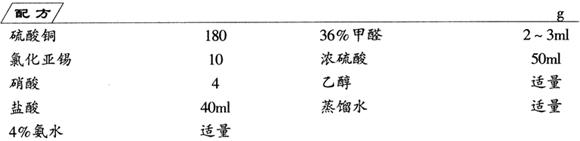 释义 | 树叶镀铜 制法 (1)敏化液的制备 在氯化亚锡中加入盐酸并加1000ml蒸馏水,待固体物溶解,即得敏化液。 (2)活化液的制备 将硝酸银溶解于1000ml水中,然后滴加4%氨水,起初产生沉淀,继续滴加,至沉淀刚好全部溶解为止,得活化液。 (3)镀铜液的制备 把硫酸铜溶解于1000ml水中,添加浓硫酸,即得镀铜液。 使用方法: (1)镀铜前树叶的处理 选择一片质地紧硬、完整的带柄树叶,放进浓肥皂水中浸泡30~40min,取出用清水漂洗后,用丝绸来回摩擦,使其表面粗糙,放入纯乙醇中浸泡5~10min。将上述处理过的叶片放入新配制的敏化液中浸泡0.5~1min,取出放进蒸馏水中漂洗,漂洗后放入活化液中,并滴入36%甲醛溶液20滴,2min后取出并用清水漂洗,此时树叶已是银光闪闪。 (2)镀铜 将叶柄用裸铜丝缠绕,并在烧杯内放入镀铜液。将绕好铜丝的叶柄放入溶液中作为阴极,铜棒为阳极。电镀的电流强度通过调节两极间距来控制,最好将电流密度控制在0.5~1A/dm2,时间约2min。 |