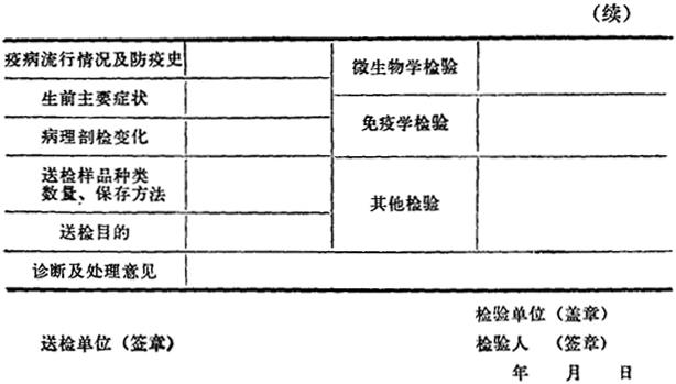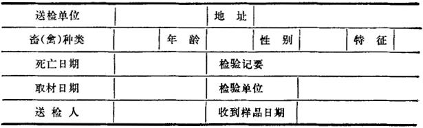 释义 | 样品的包装与寄送 如样品不能立即检验时,应冷藏。 为避免散布病原,装样品容器的表面必须用消毒剂拭擦。用橡皮塞塞紧瓶(试管)口,石蜡封固,贴上标签,注明样品来源、种类、保存方法、采集时间等,并填好送检单,用冰瓶冷藏送检。 为避免病料外漏,应立放于金属筒内,填塞防震填充料(木屑、纸渣、稻草、塑料泡沫的渣屑等)。 要尽快派专人将样品送达检验单位,远程可用航空快递小包形式投送。 样品送检单格式如下。 送检单格式 |