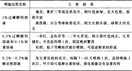向土壤中施用化肥会使肥料大量流失和氧化,损失率常高达3/5左右,经常施用化肥还会造成盆土僵化和板结。根外施肥是一种先进的施肥方法,它是根据叶片和嫩茎上的气孔能直接吸收液态营养元素的原理,将一种或两种营养元素进行合理搭配,然后溶于500~1000倍的清水中,配成0.1%~0.2%的稀释液,装入喷雾器中向叶片上喷布,喷布量越少越好,最好一掠而过。喷肥后肥效发挥得极快,2~3天后就能见到显着效果,并且耗肥量少,可大大降低生产成本,特别适合观叶花卉追肥时使用;如果用于观花类花卉,肥液喷在花瓣上会造成斑痕,以致无法观赏,对观叶类花卉喷肥则不会出现这种毛病(表4-14)。