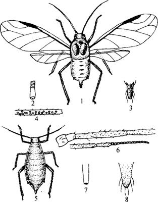释义 | 桃粉大蚜 【学名】 Hyalopterus amygdali Blanchard。 【别名】 桃粉蚜、桃大尾蚜、桃粉大尾蚜。 【分布与为害】 分布辽宁、青海、内蒙古、新疆、河北、山东、山西、江苏、浙江、安徽、江西、福建、湖南、河北、贵州、云南、四川、广东、广西、台湾等地。寄主有桃、梅花、榆叶梅、碧桃、日本晚樱、红叶李、杏、李等。成虫、若虫刺吸寄主汁液,造成叶片卷曲。 【形态特征】 无翅孤雌蚜体椭圆形,长2.3毫米,宽1.1毫米,草绿色,被白粉,体表光滑,无瓦纹,腹面具微瓦纹。中额及额疣稍隆起。触角6节,微显瓦纹,其长为体长的3/4,各节具硬尖毛。第五、六节灰黑色,第六节鞭部长为基部的3倍。气门圆形,气门片淡色,节间斑不明显,缘疣小,半圆形。腹管圆筒形,基部稍小,端部1/2灰黑色。尾片长圆锥形,有长曲毛5~6根。尾板有长毛11~13根。生殖板淡色,有毛13~15根。有翅孤雌蚜体长卵形,长2.2毫米,宽0.9毫米,被白色蜡粉。头、胸部黑色,腹部黄绿色或橙绿色。触角为体长的2/3,第三节有感觉圈18~26个,分布于全节,第四节0~7个感觉圈,第三节有毛13根。腹管短筒形,长为基宽的5倍,基部1/3收缩。收缩部有褶曲纹多条。尾片长圆锥形,端部2/3有小圆形突起,腹面有小刺突横纹,有4~5根毛。尾板半球形,有毛14~16根(图9-37)。 图9-37 桃粉大尾蚜 1.有翅孤雌成蚜 2.腹管 3.尾片 4.触角第三节 5无翅孤雌成蚜 6.触角 7.腹管 8.尾片 【生活习性】 在江西1年发生20代。以卵在桃、梅、李、杏等芽腋及枝条凹陷处越冬。翌年2月中、下旬至3月上旬,卵孵化为干母,为害新嫩芽;干母成熟后,营孤雌生殖。4月下旬至5月上、中旬是繁殖盛期,也是全年为害最严重的时期。5月下旬至6月上旬,产生大量有翅蚜,迁往禾本科的芦苇等寄主上,继续胎生繁殖后代。至10月下旬至11月上旬,又产生有翅蚜,迁回桃、梅、李、杏等越冬寄主上,雌雄性蚜交配,产卵。卵常数粒或数十粒集在一起。 在华北,越冬卵于3月下旬至4月上旬孵化,4月中旬干母成熟产生干雌,并大量繁殖后代。5月上旬产生大批有翅蚜,迁往芦苇和其他幼树。但在桃、杏等蔷薇科植物上,到6月上旬仍受到严重为害。 此蚜天敌有异色瓢虫、七星瓢虫、二星瓢虫、双斑唇瓢虫、菱斑和瓢虫、黄足光瓢虫、大草蛉、普通草蛉、黑带食蚜蝇、大灰食蚜蝇、大绿食蚜蝇、黍蚜茧蜂、蚜虫金小蜂、苹果瘤蚜小蜂。 【防治方法】 (1)保护利用天敌,应避免喷化学农药杀伤天敌,让天敌充分发生作用。 (2)蚜虫发生较多时,可选喷50%灭蚜松可湿性粉剂1500倍液,或50%抗蚜威可湿性粉剂3000倍液。喷前,以在药液中加入0.1%~0.2%的中性皂,可提高防效。在桃、梅等寄主上用乐果、氧化乐果有药害。 |