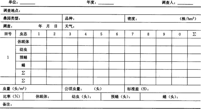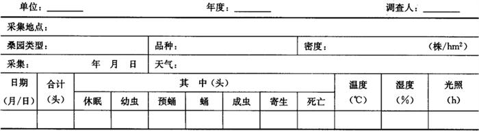 释义 | 桑芽瘿蚊测报调查方法 为害桑树的瘿蚊均属双翅目,瘿蚊科(Cecidomyidae)。其中为害桑芽的瘿蚊主要有桑橙瘿蚊(Diplosis mori Yokoyama)和桑瘿蚊(Contarinia sp.)两种。 近年,为害桑芽的瘿蚊在浙江、江苏、安徽、四川、广东、云南、山东、河北等主要蚕桑产区普遍发生,为害严重。其中桑橙瘿蚊国外分布于日本、朝鲜。国内几乎遍及浙江西北部的全部丘陵桑园和安徽、江苏、山东等省,有继续扩大蔓延之势。桑瘿蚊国内主要分布于广东。上述两种瘿蚊幼虫寄生顶芽幼叶间,以口器锉伤顶芽组织,吸食汁液,造成顶芽弯曲、凋萎、发黑、脱落、枝条封顶。连续为害后,使桑树侧枝丛生,分档开叉,枝条变短,造成桑叶减产。由于防治困难,对夏秋季桑树生长影响极大。 1 调查内容与方法 1.1 发育进度和虫口密度调查 桑橙瘿蚊发育进度和虫口密度调查,主要采用土壤淘洗和剥查桑芽内幼虫的方法。一般,土壤淘洗花工大,各调查样点得到的虫口密度变异大,但可在幼虫为害桑芽前监测桑橙瘿蚊的发育进度,进行幼虫为害的前期预测,且得到的均为老熟幼虫,生活力较强,适宜进行室内饲养观察;剥芽调查简便,各样点虫口密度变异小,调查数据准确,适合桑橙瘿蚊的系统观察。调查获得的数据可用于桑橙瘿蚊的中期预报。 1.2 越冬调查 每年11月底左右,在老熟幼虫已弹跳入土,并结成囊包后和翌年3~4月间各进行1次。采用土壤淘洗的方法进行。选择本年度桑橙瘿蚊(特别是后期)为害严重的类型桑园2~3块,每块桑园随机调查10个样方,每样方选择土壤潮湿处的重害株,在主干附近划取0.1m2的面积,取样框内15cm深的土壤,切去表面植物残渣后放入水桶内加水搅拌,直至成为较稀泥浆水,然后将泥水倒入上为1mm、下为0.5mm孔径的两只重叠放置的土壤筛中过滤,泥土堵塞筛孔时,要随时用清水淋洗筛面,并清除各种残渣。过筛后,取下层筛放入水下,再行漂洗,除去浮渣,用水摊平仔细检查筛面残留物,用毛笔尖挑出桑橙瘿蚊休眠体、幼虫等分别记载填入调查表8-117。淘得的虫体放入洁净培养皿内,用蘸水棉球保湿,用做室内观察虫源。冬、春两次调查结束后,根据调查数据,计算越冬虫口密度和越冬存活率。根据室内越冬代幼虫发育进度,预测化蛹盛期。 表8-117 桑橙瘿蚊入土虫量(淘洗)调查表 1.3 发育进度调查 采用土壤淘洗、室内观察、摘芽剥查相结合的方法进行。 1.3.1 土壤淘洗 从4月中旬开始,选择去年桑橙瘿蚊重发的桑园1块,每隔3~5天调查1次。每次调查直到筛出30头以上的桑橙瘿蚊虫体为止,在调查表8-118上分别记载休眠体、幼虫、蛹的虫量,然后将查到的虫体放入培养皿继续观察发育进度,6月中旬以后,每隔10~15天调查1次,每次调查10个样区,将实查到的虫体分别记载于表8-117。土壤淘洗调查的方法同越冬调查。 表8-118 桑橙瘿蚊(室内)发育进度调查表 1.3.2 室内观察 主要进行桑橙瘿蚊的化蛹、羽化进度调查,将每次土壤淘洗到的桑橙瘿蚊休眠体和老熟幼虫分别置于经过消毒的培养皿内的滤纸上,加水湿润后加盖观察。每天将桑橙瘿蚊的化蛹数、羽化数、寄生数和死亡数分别记载于表8-118。根据调查数据预测桑橙瘿蚊的化蛹盛期和羽化盛期。调查后要注意随时加水保湿,保湿要使用蒸馏水或放置1天以上的冷开水,保湿程度依气温而定。一般室温偏低时不宜加水过多,以免虫体感病死亡;室温偏高时要避免滤纸发干,影响桑橙瘿蚊的化蛹进度,每天加水要适量多次。化蛹阶段只要保持滤纸略有湿感,即可保证桑橙瘿蚊羽化时顺利展翅。 1.3.3 摘芽剥查 从4月中旬开始隔月进行1次,至5月中旬起,每天调查直到7月上旬,以后隔2~5天调查1次至10月中旬结束。选择桑橙瘿蚊重发类型桑园进行调查,每次随机调查50~100株桑树,每株桑树选其中一根枝条摘取顶芽,放入玻璃试管或透明的塑料袋内,再在室内逐一剥查桑芽,分龄记载寄生头数和寄生芽数。也可用棉花塞紧试管口或用细绳扎紧塑料袋口,写上调查日期,置于室内观察。分次记载管(袋)内自行出芽的幼虫数量后,清除幼虫继续观察,直至桑芽变质,然后汇总每天的虫量。调查结果随时记载于表8-119后,计算百芽寄生率和百芽虫口密度。根据桑橙瘿蚊幼虫的空间分布图式测定,每次摘芽剥查数量多少与虫口密度有关。一般平均虫量在0.3头/(芽·株)时,调查50(芽/株)的取样误差大约在30%左右,调查100(芽/株)的取样误差大约20%;当平均虫口密度在1.5头/(芽·株)时,调查50(芽/株)的取样误差大约20%,调查100(芽/株)的取样误差大约15%。 表8-119 桑橙瘿蚊芽害率调查表 2 预测预报方法 2.1 化蛹、羽化高峰和喷药防治适期预测 依据室内发育进度调查和土壤淘洗结果,当室内调查到累计15%的幼虫开始进入蛹期,并且田间土壤淘洗得到的桑橙瘿蚊有5%~10%虫蛹时的日期,可确定为化蛹始盛期。同样当调查到室内累计50%的幼虫开始进入蛹期,田间土壤淘洗到25%~30%以上桑橙瘿蚊蛹体时的日期,可确定为化蛹盛期(注:以田间实查出现化蛹高峰至羽化高峰的间隔时间估计)。然后,根据发生的世代和未来数天内的天气预报的气温和雨量,加上确定的化蛹历期即为桑橙瘿蚊的羽化始盛期和盛期,可预报为桑芽保护防治适期。一般越冬代蛹期为7天,第一代为5天,第二、三、四代(依盛夏的高温、干旱程度)为5~10天,第五代为10天。 2.2 卵孵盛期、幼虫发生期和桑橙瘿蚊中期预报 根据摘芽剥查到的幼虫发育进