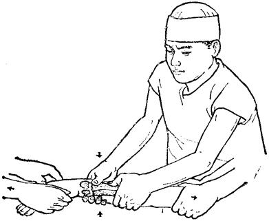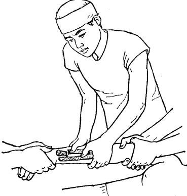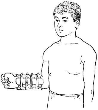 释义 | 桡骨下1/3骨折合并尺骨头脱位 桡骨下1/3骨折合并下桡尺关节脱位,又称盖里阿济(Ga1eazzi)氏骨折,约占0.3%,临床上可分为三型。 Ⅰ型:桡骨干下1/3骨折,合并尺骨下端骨骺分离。皆为儿童。 Ⅱ型:桡骨干下1/3呈横断、螺旋或斜形骨折,移位较多,下尺桡关节明显脱位。 Ⅲ型:桡骨干下1/3骨折,下桡尺关节脱位合并尺骨干骨折或弯曲畸形。 【症状与诊断】前臂及腕部疼痛、肿胀,下桡尺关节有明显畸形和异常活动,前臂旋转功能丧失。X线摄片检查可了解骨折移位及下尺桡关节脱位情况。 【整复方法】 一、拔伸牵引:伤员仰卧,肩外展,屈肘90度,前臂中立位,一助手握肱骨髁部,另一助手两手分别握伤手拇指和四指,对抗牵引,但牵引时应加大拇指一侧的牵引力,以对抗旋前方肌所造成的桡骨远折段向尺侧成角移位。 二、对扣捏合,整复尺骨小头脱位:桡骨折重迭移位矫正后,术者先用一手拇指及食、中二指对向捏挤尺骨头背侧或掌侧移位,另一手拇指和食、中、无名三指分别置于桡骨和尺骨远端,由桡侧和尺侧用力捏合,即可使向尺侧移位的尺骨头复位(图10~58),复位后将合骨压垫放于尺桡骨远端的桡侧、背侧和尺侧,用胶布固定,此时远侧助手改为双手环抱腕部维持牵引。 图10~58 对扣捏合矫正尺骨小头脱位 三、分骨提按矫正骨折向掌背侧移位:如桡骨远折段向尺侧、掌侧移位,术者一手分骨,另一手拇指按近折段向掌,食、中、无名三指提远折段向背,如桡骨远段向尺、背侧移位,术者一手分骨,另一手拇指按远折段向掌,食、中、无名三指提近折段向背,使之对位(图10~59)。如不能复位,可用折顶法矫正。 图10~59 分骨提按矫正骨折向掌背侧移位手法 四、儿童伤员,可发生尺骨远段向尺、背侧弯曲,或尺骨下端骨骺分离,而无尺骨小头脱位。整复时,应先矫正尺骨移位,再矫正桡骨折移位。在对抗牵引的同时,术者一手四指由掌侧扣住腕部桡侧,拇指由尺侧向桡侧推顶尺骨成角部,另一手拇指由背侧压尺骨向背成角处,其余四指紧抵掌侧作对抗。两手同时用力即可矫正尺骨两个方向的成角畸形和骨骺分离。 【固定方法】 一、小夹板固定: (一)器材:木板4块(规格与前臂双骨折夹板同,唯尺侧板不超过腕关节),塔形分骨垫2个、半环型垫1个、平垫2个,纱布衬垫、布带、三角巾等。 (二)方法:助手维持牵引,术者用纱布衬垫环包前臂和腕部,紧贴桡骨尺侧缘,放塔形分骨垫于骨折线处,胶布固定。在骨折处的掌背侧各放一平垫,胶布固定。先放掌背侧板,再放桡尺侧板,桡侧板下端稍超腕关节,以限制手的桡偏(图10~60)。四条布带固定,三角巾悬吊前臂于胸前。 图10~60 桡骨下1/3骨折合并尺骨小头脱位小夹板固定方法 (三)固定时间:4~6周。 二、闭合插钢针小夹板固定:适于三角软骨破裂尺骨小头脱位严重,单用小夹板固定不稳定者。 (一)器材:直径2毫米不锈钢针1支,直角铁丝托1个、纱布、绷带等。 (二)方法:两助手继续牵引维持位置,第三助手一手用拇指和食、中、无名指分骨固定桡骨断端,另一手拇指和食、中、无名指分别置于尺桡骨下端的尺桡侧向中心挤捏,使尺桡关节紧密对合。术者持钢针由尺骨小头的尺侧向桡骨远端垂直钻入,固定下尺桡关节,针尖勿超过桡骨下端外侧骨皮质,针尾露于皮外0.5厘米,无菌敷料包扎,小夹板固定。但尺侧板的末端应有一孔道,使外露针尾通过。 (三)固定时间:钢针固定3~4周,夹板固定5~6周。 【注意事项】 一、术后练功和术后观察同尺桡骨双骨折,但在固定期间防止腕关节桡偏。 二、伤后四周,骨折已有纤维连接,手法复位难以成功,如有明显畸形,影响前臂旋转功能,可先作桡骨切开复位内固定,矫正畸形,待桡骨愈合后如仍有前臂旋转功能受限和疼痛,再作尺骨小头切除。 【附】 尺骨小头切除术 切口沿尺骨远端尺侧,自尺骨小头上3厘米,至尺骨茎突下1厘米。于尺侧伸腕肌和尺侧屈腕肌之间进入,将尺侧伸腕肌牵向背侧,屈腕肌牵向掌侧,即可显露出尺骨小头。用布巾钳将尺骨小头提起,骨膜外锐性剥离,显露尺骨远端,在剥离掌侧时,注意勿损伤尺动静脉及尺神经,用锐利骨刀连同骨膜切除尺骨远端约1.5厘米,并将残端锉圆严密止血,缝合切口,术后石膏托固定。 |