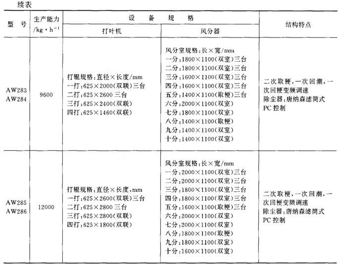 释义 | 梗叶分离设备 (-)COMAS打叶机组 1.结构特点 (1)COMAS打叶机组主要是由THM打叶机、AC风分器、SAMO风分器等所组成。不同型号的打叶机组由不同型号、不同数量、不同尺寸的打叶机及风分器组合而成。6R/4S/8AC打叶机组(生产能力12000kg/h)见图9-1-11所示。 图9-1-11 COMAS12000kg/h打叶机组示意图 1-打叶机 2-SAMO风分器 3,4-AC风分器 5-打叶机 6-SAMO风分器 7-AC风分器 8-打叶机 9-AC风分器 10-打叶机 11-AC风分器 12-回梗管路 13-汇总运输带 (2)打叶机辊筒转速通过移动调速皮带轮来改变。框栏有旋转式与固定式,可以更换。为了安全,只有打叶辊停止运转时检修门方能打开;只有检修门安全关闭,打叶辊方能启动。 (3)AC风分器可进行两次风分,见图9-1-12所示。物料进入第一个风分室后,抛料器将物料均匀地抛出进行风选,未分出的叶片及烟梗在第二个风分室内进行同样过程的风选,剩余物料通过旋转出料器排出。分选出来的叶片从切向落料器排出,风分空气循环使用,只有少部分空气需经净化后排出。 图9-1-12 AC型风分器 1-切向落料器 2、3-风分室 4-切向落料器 5-抛料器 6-风机 (4)SAMO风分器见图9-1-13所示,物料从上部送入,被旋转圆盘抛起后进行风选,叶片经输送风管至切向落料器排出,剩余物料落到圆环槽内,由旋转刷刷入旋转出料器排出。 图9-1-13 THM打叶机与SAMO风分器组合示意图 1-THM打叶机 2-风管 3-旋转圆盘 4-旋转刷 5-旋转出料器 6-风机 7-切向落料器 2.主要技术参数 (1)设备性能:不同型号部分打叶机组的性能见表9-1-23所示。 表9-1-23 不同型号的部分打叶机组设备性能 注:*总装机功率一项是按原文换算,但可能有误——编者注。 (2)设备参数:部分不同型号打叶机及风分器基本参数见表9-1-24所示。 表9-1-24 部分不同型号的打叶机与风分器基本参数 3.生产厂家 意大利科马斯公司。 (二)AW21~AW248型打叶机组 1.结构特点 (1)该系列设备生产能力为1500~12000kg/h,不同产量的机组由不同规格的打叶机和风分器组合而成,各种不同生产能力的机组见表9-1-25。打辊转速的调整有变径带轮和变频调速二种。打叶机与风分器规格均已采用系列化。 表9-1-25AW21~AW247打叶机组 (2)该设备的改进形式之一见图9-1-14所示,一级打叶采用比例分配喂料、多台打叶机并联,以降低打辊负荷;在回打之前增加长梗分离装置,以提高打出烟梗的长梗比例。 图9-1-14 一种改进型打叶机组组合布置图 1-刮板喂料机 2-打前喂料机 3-比例分料器 4-打叶机 5-收集带 6-单室风分器(AC) 7,8-双室型风分器 9-二打喂料机 10-分料器 11-二级打叶机 12-收集带 13,14-二级风分器 15-三级打叶机 16-回梗落料器 17-三级风分器 18-振槽 19-分梗吸口 20-皮带机 21-落料器 22-四级打叶机 23-四级风分器 24-振槽 25-回梗吸口 2.主要技术参数及外形尺寸 (1)外形尺寸及装机功率:THM打叶机外形尺寸及装机功率见图9-1-15、图9-1-16及表9-1-26。 图9-1-15 THM型打叶机安装尺寸图 图9-1-16 THM双联型打叶机安装尺寸图 表9-1-26THM型打叶机的基本参数 注:生产厂家不同表中尺寸会略有不同。 AC/2与AC/1风分器外形尺寸及装机功率见图9-1-17、图9-1-18及表9-1-27。 图9-1-17 AC/2型风分器外形图 图9-1-18 AC/1型风分器外形图 表9-1-27AC型风分器基本参数 注:①AC/2为双风分室型,AC/1为单风分室型。 ②不同生产厂家生产的产品其参数会略有不同。 (2)打叶质量指标: ≥12.5mm2的烟片: 78%~85%; ≤3mm2的烟片: ≤2.5%; 叶中含梗率: ≤2.5%; 梗中含叶率: ≤1%。 3.生产厂家 北京长征高科技公司、铁道部徐州机械厂、宁波轻工机械厂、秦皇岛烟草工业机械厂等。 (三)MacTavish公司打叶机组 1.结构特点 (1)MacTavish公司打叶机组主要是由SR打叶机、MC打叶机、CF风分器、VSL-C风分器等所组成。不同生产能力的打叶机组由不同型号、不同数量、不同尺寸的打叶机及风分器组合而成。对于生产能力较高的打叶机组,其一级与二级打叶机均可两台以上并联使用。见图9-1-19所示(一级两台并联)。(图9-1-19、图9-1-20在906页、907页上)。 图9-1-19 MacTavish机械制造公司6000kg/h打叶机组 1——级SR打叶机 2,3,4,5-CR风分器 6-二级SR打叶机 7,8,9-CF风分器 10-三级SR打叶机 11-CR风分器 12-VLSC风分器 13-四级SR打叶机 14-VLSC风分器 图9-1-20 MacTavish公司SR打叶机 (2)SR打叶机组见图9-1-20所示,其结构形式与COMAS公司THM打叶机类似。系列化的打叶机其辊筒与框栏径向尺寸相同,宽度尺寸随生产能力的增加而增大。 (3)VLS-C风分器及逆流的CF风分器结构类似,但物料进入风分器的方向相反,高度与长度尺寸也有不同,见图9-1-21及图9-1-22所示。风分箱中物料的风分过程如图9-1-23所示,物料在两个抛料器的抛撒过程中呈“S”型线路运动将叶片风分出去。风分空气大部分循环使用。 图9-1-21 VLS-C风分器 图9-1-22 逆流CF型风分器 图9-1-23 风分箱内空气及物样流向示意图 2.主要技术参数 (1)设备性能:不同型号部分打叶机组的性能见表9-1-28所示。 表9-1-28 不同生产能力的部分打叶机组性能 (2)设备安装尺寸: ①SR打叶机安装尺寸:参见图9-1-20,见表9-1-29所示。 表9-1-29 SR打叶机安装尺寸 ②CF风分器及VLS-C风分器安装尺寸:参见图9-1-21及图9-1-22、图9-1-123,见表9-1-30所示。 表9-1-30CF型及VLS-C型风分器安装尺寸 3.生产厂家 美国MacTavish公司。 (四)AW51~AW517打叶机组 1.结构特点 (1)该机组结构基本上与MacTavish公司的打叶设备相同。主要由打叶机、逆流式风分器、垂直式风分器等组成,设备型号
