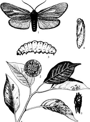 释义 | 梨叶斑蛾 【学名】 llliberis pruni Dyar.。 【别名】 梨斑蛾、星毛虫、饺子虫。 【分布与为害】 中国各地均有分布。寄主有海棠、桃、雏菊、垂丝海棠、樱花、西府海棠、梨等。幼虫食芽、嫩叶、花朵,以后包叶为害。 【形态特征】 成虫体长9~13毫米,翅展22~30毫米,黑色。翅半透明,翅脉清晰可见。中脉贯串中室。雄蛾触角双栉齿状,雌蛾双锯齿状。卵长0.7~0.8毫米,椭圆形。初产时乳白色,后渐变为黄白色,近孵化时,紫褐色。数十至百余粒,单层排列成块状(图6-18)。末龄幼虫体长20毫米。初孵及越冬出蛰的小幼虫淡紫褐色,成长后体呈纺锤形,白色,有断续的黑色背线,亚背部有1排黑色斑块,每节上有4簇毛丛。蛹长约12毫米,初为黄白色,羽化前变为黑色,包在长纺锤形白色薄茧中。 图6-18 梨叶斑蛾 1.成虫 2.卵 3.幼虫 4.蛹 5.梨芽被害状 6.梨叶被害状 【生活习性】 在山东1年1代。以2龄幼虫在包叶内结薄茧越冬。翌年3月下旬至4月初越冬幼虫出蛰,先食害芽、花朵及嫩叶,以后食叶为害。幼虫可转移食害4~5片叶,粪便排在包叶内。5月下旬至6月上旬,幼虫老熟转移它叶化蛹。叶小即重叠在叶间化蛹。蛹期9~11天。6月上、中旬为成虫盛发期。成虫白天交配、产卵。卵多产于叶背。卵期7天。初孵幼虫食叶片呈网状,至6月底7月上旬达2龄时,潜藏越夏后过冬。 【防治方法】 人工捕杀包叶内幼虫。 幼虫出蛰与幼虫孵化期,喷Bt乳剂500倍液,或敌百虫1000倍液。 |