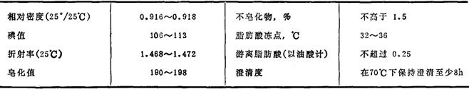 理化常数:相对密度(15°/15℃)0.923~0.926,(20°/4℃)0.917~0.925,脂肪酸凝固点32~36℃,皂化值189~197,碘值102~112,折光指数(20℃)1.469~1.475。