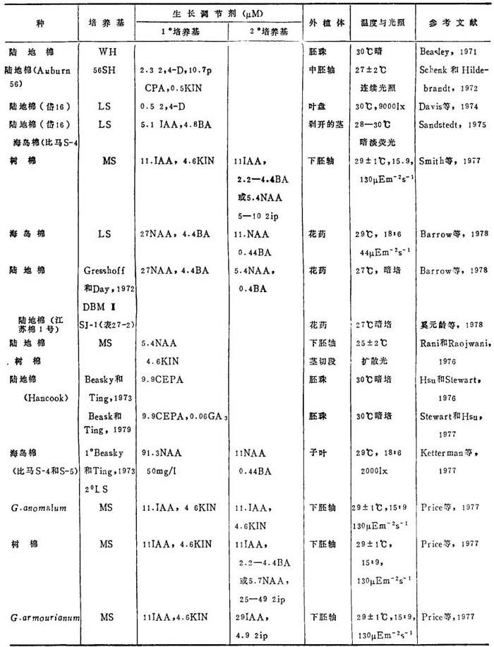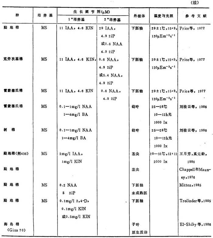 释义 | 棉花 棉花属于锦葵科(Malvaceae)棉属(Gossypium L.),棉属包括39个种,其中6个种是四倍体(2n=52),其余33种是二倍体(2n=26),分布于非洲,中、南美洲,大洋洲,分属于六个基因组群:A、B、C、D、E、F。四倍体棉种是双二倍体,基因组为AD。四种栽培种,其中二种二倍体,二种四倍体。二倍体种分属于A和B基因组。四倍体栽培种陆地棉(G.hirsutum)栽培分布于全世界产棉区,热带干旱灌溉棉区种植另一种四倍体栽培种海岛棉(G.barbadense)。当前育种目标,着重于纤维品质改良,矮杆、早熟,有限开花习性、多抗性和无毒棉,以利棉产品的综合利用。 (一)研究进展 棉花各棉种一栽培种和野生种和种间杂种已报道了六类组织培养:即愈伤组织、胚珠-胚,茎尖、花药和原生质体培养,以及体细胞胚胎发生。这些研究的目标不同。愈伤组织培养旨在启动细胞悬浮培养体;原生质体分离和融合,继而再生植株,以形成体细胞杂种;胚珠培养试图取得棉纤维发育的基础信息,较好地了解进而控制纤维产量和品质;胚培养用于研究胚拯救技术,以利于在正常条件下败育的胚取得杂种;茎尖培养以利于产生大量同质再生植株,供珍贵材料和杂种的繁殖和体细胞遗传研究;花药培养用以针对育种目标和诱变研究产生单倍体和、或双单倍体,一举而取得纯合个体,以缩短育种年限,和产生更高的杂种优势,以利于杂交棉花的生产发展。 本文将就每类组织培养技术分析,以揭示其在棉花育种和生产中的潜在应用价值。 1.愈伤组织培养 表27-1列举曾启动愈伤组织的棉种。Beasley(1971)首次报道从陆地棉的珠柄外植体或培养的胚珠珠孔区域启动愈伤组织。从而开展了生长调节剂对受精的和未受精胚珠培养的生理作用研究。Hsu和Stewart(1976)在研究胚珠生长和发育中,从陆地棉胚珠珠孔区域产生的松散愈伤组织里。由于2-氯乙烯磷酸(CEPA)向培养基放出的乙烯,刺激培养中愈伤组织生长和扩展。进一步研究CEPA+GA3大大地促进愈伤组织生长。 表27-1 棉属种的愈伤组织培养 Schenk和Hildebrandt(1972)从陆地棉中胚轴外植体成功地建立了松散愈伤组织培养物。Davis等(1974)用叶外植体愈伤组织产生了悬浮培养物。Rani和Bhojwani(1976)从陆地棉和树棉取得生长慢松散愈伤组织。 Katterman等(1976)用强抗氧化剂二硫苏糖醇(DTT)和高浓度NAA培养海岛棉子叶启动紧密愈伤组织。另一抗氧化剂抗坏血酸或聚乙烯吡咯烷酮(PVP)对阻制多酚氧化效果不大。愈伤组织继代,包括改变碳水化合物用葡萄糖代替蔗糖和不加DTT。观察到继代愈伤组织生根,也再生植株一株。 Smith等(1977)用规定条件启动和继代G.arboreum下胚轴产生愈伤组织,葡萄糖、高光强和高温相配合,结果愈伤组织生长最适,无褐化。取得了再生植株。 表27-2 棉花花药培养基SJ-1 Price等(1977)和Price与Smith(1977)(表27-3)用5个种启动和继代愈伤组织,以葡萄糖为碳源和高光强,愈伤组织继代要求不同浓度的不同生长调节剂。由于葡萄糖和高光强,培养基褐化或变色受到抑制。 表27-3 棉属种愈伤组织诱导培养基 愈伤组织诱导,褐化和继代中的困难,棉属业已克服。采用葡萄糖,高光强和29-30℃培养条件,可避免酚的氧化。从愈伤组织再生植株取得初步成功。上述再生植株例证,可能是从子叶组织直接产生的。但是Price与Smith(1979)从克劳次基棉下胚轴取得体细胞胚胎发生。Davidonis与Hamilton(1983)培养陆地棉下胚轴切段,经继代二年以上的愈伤组织获得胚状体和再生植株。刘桂云(1983)用G.davidsonii,叶片为外植体观察到胚状体。刘桂云等(1986)以雷蒙德氏棉,G.davidsonii和中棉的幼叶培养,G.davidsonii培养体经愈伤组织→胚状体→再生不完全植株。雷蒙德氏棉偶见幼芽;草棉(G.herbaceum)出叶;比克氏棉(G.bickii)形成大量根,不易取得胚状体。王月芳、奚元龄(1986)用陆地棉栽培品种荆436主茎茎尖培养再生植株,并在再生植株茎基部产生愈伤组织,连续产生植株和不定芽,显示了可能产生大量无性系的新景象。 Mitten(1985)培养陆地棉胚轴取得再生植株成功。提出棉属组织培养对已熟知的生长素一细胞分裂素互作反应不同,生长素对球形胚增殖无效,而细胞分裂素以2ip为优,为唯一关键因子。首先在愈伤组织培养体鉴别出胚形成(胚性)愈伤组织,常需经过长时期多次继代后才能启动发育,必须从周围的非胚形成愈伤组织(衰退的,深色)中把胚形成愈伤组织(白色)分开。其次进行选择性继代,使胚保持在发育早期。在长期继代中,球形胚解组织化增殖许多小细胞团,转而发育成更多球形胚,这种循环的不断发展,是培养体系的关键部分。延长培养球形胚进一步发育产生心形胚和鱼雷形胚,发芽成株。 Davidonis等(1983)用加与不加生长素循环培养陆地愈伤组织,以增殖胚形成愈伤组织类型。植物遗传公司学者认为生长素浓度无关重要。但一旦出现胚形成愈伤组织,要加少量细胞分裂素以保持之。Rangan等(1984)报道陆地棉悬浮培养体增殖体细胞胚胎发生。Mitten等(1984),Rangen等(1984),王月芳、奚元龄(1986)曾取得许多再生植株。Anderson,正在研究体细胞无性系变异,Altman研究这些再生植株的细胞遗传学。Davidonis(1983)和刘桂云等(1986)取得了不完整植株(无根)。经验指出再生植株技术改进,主要在于改进胚质量(生产胚性细胞)。应予继续努力。 2.胚珠-胚培养 棉花胚珠离体培养有二个目的。(1)为纤维发育生理学提供有价值信息;(2)取得异种间杂种。许多情况下,活体杂种败