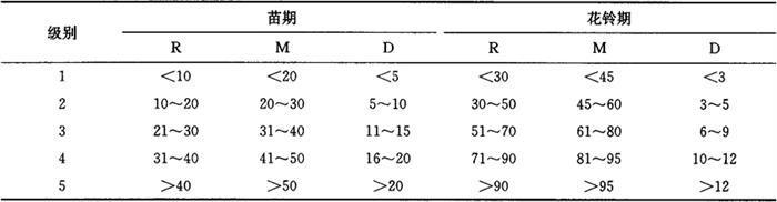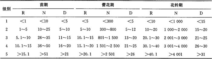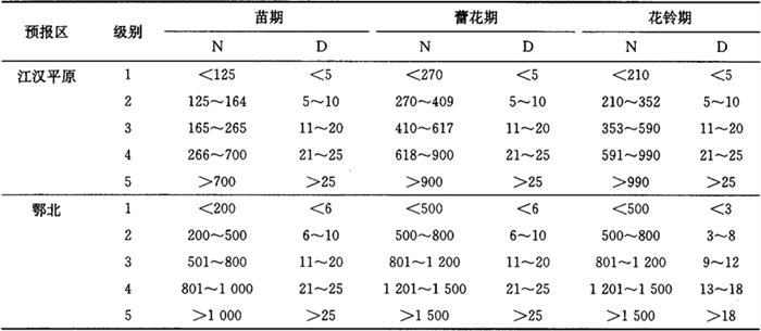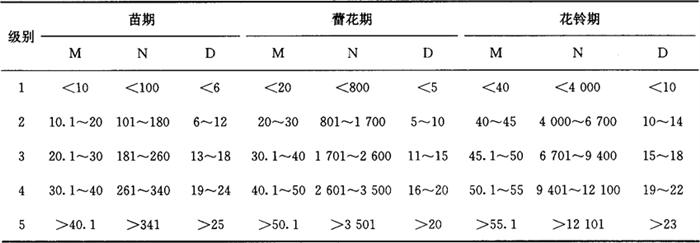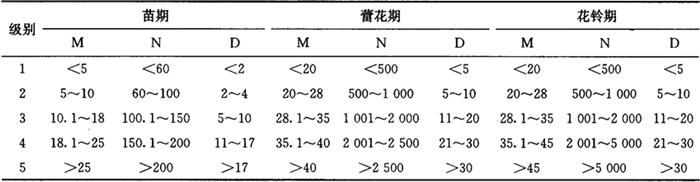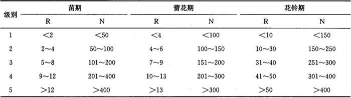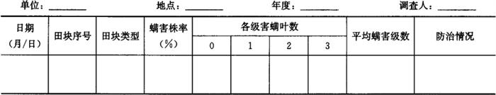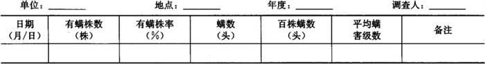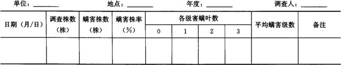 释义 | 棉花叶螨测报调查方法 棉花叶螨广泛分布在全国各个棉区,是棉花的主要害虫。为害棉花的常见种类有朱砂叶螨(Tetranychus cinnabarinus Boisduval)、二斑叶螨(Tetranychus urticae Koch)、截形叶螨(Tetranychus truncatus Ehara)、土耳其斯坦叶螨(Tetranychus turkestani Ugarov et Nikolski)等。朱砂叶螨又名红叶螨,二斑叶螨又名棉叶螨。其中土耳其斯坦叶螨只分布在新疆棉区,朱砂叶螨和截形叶螨在我国其他棉区都有分布,两者有时互为优势种。两种叶螨的为害状有明显不同。朱砂叶螨初期为害后,棉叶正面出现黄白斑,3~5天后,叶面为红色,为害加重时,棉叶卷曲直至脱落。截形叶螨为害的棉叶仅出现黄白斑,为害加重时,黄白斑面积扩大,不会出现红色和卷叶。 1 主要影响因子 1.1 温湿度 发育起点温度7℃,最高42℃。发育最适温度25~31℃,最适相对湿度35%~55%。高温、干旱是猖獗发生的重要标志。 1.2 降雨量 大雨对棉花叶螨有机械冲刷作用。在发生为害的主要时期,降雨量偏多,强度大,对其发生有明显的抑制作用。反之,为害就重。 1.3 棉田环境 靠近沟渠、道路、井台、坟地、村庄、菜园、玉米、高粱、豆类、桑树、刺槐等的棉田,棉花与多种作物间作套种,田间杂草多的,为害都比较重。反之,为害较轻。 2 调查内容与方法 2.1 春季虫源基数调查 2.1.1 调查时间 3月份,平均气温稳定通过6℃以上时进行。 2.1.2 调查对象 2.1.2.1 棉花前茬作物 南方棉区主要在蚕豆上调查,北方棉区在小麦上调查。 2.1.2.2 寄主杂草 在棉田内及附近,选择3~5种主要寄主杂草(常见的有婆婆纳、佛座、马鞭草、蛇莓、益母草、乌蔹草、风光轮菜、野苜蓿、蒲公英等)。 2.1.3 调查取样方法 共调查2次,间隔10天左右。在棉花前茬作物上共调查2~3块田,每块田采用5点取样法,共调查50~100株(蚕豆按枝取样)。在田内寄主杂草上调查,采用随机取样,每种杂草共调查50~100株。记载有螨株率、百株成螨数。以两次调查的平均值作为当年春季棉花叶螨的虫源基数。结果记入表5-35。 表5-35 棉花叶螨春季虫源基数调查表 2.2 棉田虫情、天敌和棉花被害情况调查 2.2.1 棉田系统调查 2.2.1.1 调查时间 从齐苗开始,每5天调查1次,至吐絮盛期止。 2.2.1.2 调查方法 根据当地棉花叶螨发生的特点,选择3~5种类型田。每种类型田选1块667m2以上面积的棉田,采用Z字形取样,按田块大小合理安排样点,每块田取50株棉花。苗期查全株,现蕾后,每株调查主茎上(指最上部主茎展开叶)、中、下(指最下果枝位叶)部各1片叶。记载成螨数、螨害级别,并分别与苗期(出苗至7片真叶)、蕾花期(8片真叶至开花盛期)、花铃期(开花盛期至吐絮盛期)各定1次调查田。记入表5-36。 表5-36 棉花叶螨系统调查表 2.2.1.3 螨害分级标准和计算平均螨害级数的方法 以朱砂叶螨为害为主地区的螨害分级标准: ◆0级:叶片未受害; ◆1级:叶面有黄色斑块; ◆2级:红色斑点占叶面1/3以下; ◆3级:红色斑点占叶面1/3以上。 平均螨害级数=∑(某级螨害级数×该级叶片数)/总叶片数…(1) 2.3 大田普查 2.3.1 普查时间 分别于苗期、蕾花期、花铃期棉花叶螨为害高峰前,各进行1次普查。 2.3.2 普查方法 每种类型田应该查3块以上。应特别注意对历年棉花叶螨发生重的棉田进行调查。按Z字形目测调查。每块田每次查50株,对有为害状的棉株,取主茎上(指最上部主茎展开叶)、中、下(指最下果枝位叶)部各1片叶,记载螨害级别。结果记入表5-37。 表5-37 棉田棉花叶螨普查记载表 2.4 观测圃螨害情况调查 2.4.1 观测圃设置 分别从苗期、蕾花期、花铃期的初期开始(约在5月初、6月初、7月中旬初),于系统调查田中,选定棉花叶螨发生程度中等的棉田1块,面积为200~350m2。在每个发生为害期内(约40天),不针对棉花叶螨进行防治,以保持螨害的自然消长。 2.4.2 调查取样方法 与棉田系统调查方法相同。结果记入表5-38。 表5-38 观测圃螨害情况记载表 2.5 天敌调查 2.5.1 调查方法 在观测圃和一块棉花叶螨发生中等的系统调查田内,采用定田不定株调查,5点取样。苗期查50株,蕾花期和花铃期各查10株。每5天调查1次,查全株,记载各类天敌有效虫态的数量(表5-39)。 表5-39 棉田棉花叶螨天敌消长记载表 3 历年测报资料的统计汇总 3.1 棉花叶螨的发生为害期 3.1.1 棉花叶螨的发生为害统一划分 ◆苗期:棉花出苗至7片真叶期; ◆蕾花期:8片真叶至开花盛期; ◆花铃期:开花盛期至吐絮盛期。 3.1.2 发生为害期始期、末期、高峰期统计标准 3.1.2.1 始期 指各类型田平均有螨株率或螨害级数开始达到防治指标的日期。 3.1.2.2 末期 指各类型田平均有螨株率或螨害级数最后达到防治指标的日期。在上一发生为害期和下一发生为害期之间无明显分界时,以该发生为害阶段的终止期,作为上一发生为害期的末期。 3.1.2.3 高峰期 指各类型田平均有螨株率或螨害级数达到最高的日期。 3.2 棉花叶螨的发生量和发生程度 3.2.1 发生量 以各发生为害时段发生高峰期,各类型田的平均有螨株率或百株螨量表示。 3.2.2 发生程度的分级 以平均最高有螨株率或百株螨量统一划分为5级: ◆1级:指受害允许密度以下的有螨株率和百株螨量; ◆2级:指介于1级和3级之间的有螨株率和百株螨量; ◆3级:指多年有螨株率和百株螨量的平均值; ◆4级:指介于3级和5级之间的有螨株率和百株螨量; ◆5级:指该地区一些发生最高年份的有螨株率和百株螨量。 划分棉花叶螨发生程