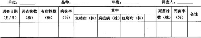 | 释义 | 棉花苗期病害测报调查方法 棉花苗期病害发生种类很多,其中以立枯病(Rhizoctonia solani Kühn)、炭疽病(Colletotrichum gossypii Southw.)、红腐病(Fusarium monili forme Sheldon)发生普遍,为害较重。此外,还有猝倒病、棉疫病等,一般为混合发生。棉花苗期病害主要为害棉苗根茎部位,造成棉株生长不良,长势较差,严重的导致棉苗死亡,造成不同程度的缺苗断垄。全国各主要棉区均有发生。 1 主要影响因子 1.1 病原菌初侵染源 棉花苗期病害病原菌可潜伏在棉籽上、土壤中或病株的烂铃、残枝落叶上越冬,成为来年的初侵染源。因此,在老棉区棉花苗期病害一般发生较重。 1.2 温湿度 棉花育苗阶段,如遇低温、阴雨,棉种发芽慢,出苗难,易受病菌侵染,导致烂籽、烂芽。出苗后受低温影响,根系呼吸作用减弱,光合作用差,棉苗生长缓慢、脆弱、抗病力降低。病菌侵染发病的最适温度分别是:立枯病17~23℃、炭疽病25~30℃、红腐病19~24℃。土壤湿度大,有利病菌生长发育,若土壤湿度分别超过80%和85%时,红腐病、炭疽病的为害都会加重。立枯病适宜的湿度范围更宽,一般是湿度愈高,发病愈重。 1.3 其他影响因素 棉种成熟度差,田头、宅旁堆贮带病棉秸秆多,整地质量差,播种过早、覆土过深、地势低洼、土质黏重、多年连作、田间管理不善等,都能加重病害发生。 2 调查内容和方法 2.1 系统调查 根据当地棉花品种的布局状况和生态类型,选择播种较早的棉田或苗床1~2块,棉田面积不小于2×667m2。每块田采用5点取样,定苗前每点查20株,定苗后每点查10株。从棉苗出土后开始,至6月上旬结束,每7天调查1次发病情况,统计病株率和死苗率。结果记入表5-1。 表5-1 棉花苗期病害系统调查表