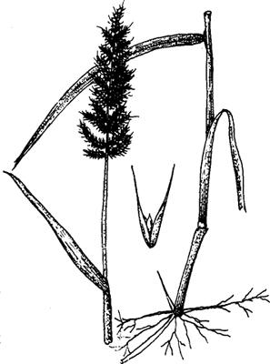 〔形态特征〕 越年生或一年生草本,高15~75厘米。秆丛生,披散或基部膝曲上升,有时近直立,具4~5节。叶鞘光滑无毛,下部长于节间,中上部渐短于节间;叶舌膜质,常2裂或先端呈不整齐齿裂;叶片条形。花序圆锥状直立,分枝稠密或疏松;小穗含1花,长约2毫米,灰绿色或部分带紫色;两颖近等长,先端裂口处有1~3毫米长的直芒;外稃中脉延伸成约2毫米的细芒。颖果椭圆形。