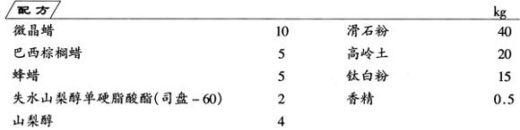 释义 | 棒状香粉 制法 先将三种蜡熔化,使温度高于熔点10~30℃,在搅拌下加入司盘-60和山梨醇,充分混合后,加入滑石粉、高岭土、钛白粉,充分搅拌,混合均匀。待温度冷却至50℃时加入香精,在搅拌下冷却,造粒,粉碎后压制成型,即为成品。 |