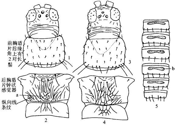 图2-28 两种蓟马的形态特征比较 1.棕榈蓟马头及前胸背面 2.棕榈蓟马后胸背面(a.示钟形感觉器) 3.亮蓟马头及前胸背面 4.亮蓟马后胸背面 5.棕榈蓟马雄虫腹部第Ⅲ~Ⅷ节腹面(b.示腹腺域) 3.生活习性 广东一年20多代,周年繁殖,3~10月为害瓜类和茄果类蔬菜,秋季发生为害重。慈溪市有棚室条件下年13~16代,年发生3个为害高峰,3月为第一个高峰,主要为害大棚茄子、黄瓜等;第二个高峰为5月下旬至6月上旬,主要为害露地丝瓜、冬瓜、西瓜、黄瓜、茄子等;第三个高峰为9~10月,主要为害反季节栽培的秋大豆、秋菜豆、秋黄瓜等。成虫活泼,善飞,畏光,喜蓝色,多在节瓜嫩梢或幼瓜毛丝中取食,部分在叶背为害。以孤雌生殖为主,偶有两性生殖。卵散产于叶肉组织内,3龄末期幼虫停止取食,落入表土“化蛹”。发育适宜温度为15~32℃,土壤含水量8%~18%为最适,“化蛹”和羽化率都高。卵期2~9天,每雌产卵60~100粒,若虫期3~11天,“蛹期”3~12天,成虫寿命20~50天。 4.防治方法 (1)清洁田园 清除田间残株、杂草,消灭虫源。用营养土方育苗,栽培时用地膜覆盖,减少出土成虫为害。 (2)棚室悬挂蓝色板诱杀 每10米左右挂一块板,诱杀色板挂在略高于蔬菜10~20厘米处,以减少成虫产卵为害。 (3)以紫外线隔断膜作棚膜 可有效地防除棕榈蓟马,日本推广此法,不仅防虫还可防治菌核病、灰霉病。 (4)药剂防治 棚室黄瓜或茄子定20~50株,每株查上、中、下3张叶片,每5天查1次,记录成若虫数量。当成虫达到高峰时,结合棚室内温度5~10天内进行防治,或每株若虫量3~5头时进行防治。药剂可选用10%吡虫啉可湿性粉剂每公顷300~750克,对水喷雾,防效可达91.4%~100%,或17.5%蚜螨净可湿性粉剂每公顷300克,防效90%以上,或80%巴丹可溶性粉剂2000倍液,或21%灭杀毙乳油6000倍液。每隔7~10天喷1次,连续防治2~3次。 |