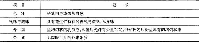 | 释义 | 植物蛋白饮料 花生乳(露)(摘自QB/T2439) (一)范围 本标准规定了植物蛋白饮料~花生乳(露)的技术要求、检验方法、检验规则和标志、包装、运输、贮存的要求。 本标准适用于以花生仁为原料,经加工、调配后,再经高压杀菌或无菌包装制成的乳浊状植物蛋白饮料。 (二)技术要求 1.原辅材料要求 (1)花生仁 应符合GB/T1533的要求。 (2)其他原辅材料 应符合GB/T10791的有关规定。 2.感官要求 感官应符合表5-2-43的规定。 表5-2-43