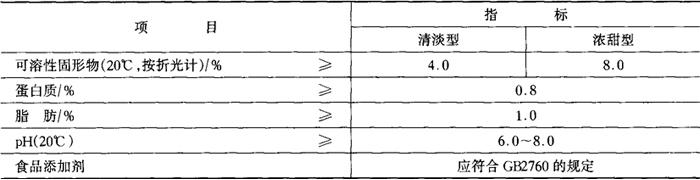 5.卫生指标 卫生指标应符合GB16322的规定。 (三)检验方法 1.感官 (1)气味与滋味 开启包装容器后,立即嗅其香气,品尝其滋味,检验有无异常气味与滋味。 (2)色泽、外观及杂质 将包装容器内的样品摇匀后,倒入无色透明的容器内,置于明亮处,观察其色泽、外观及杂质。 2.净含量 在温度(20±2)℃条件下,将摇匀的样液沿量筒壁缓慢倒入量筒中,1min后,读其容积数。 3.理化指标 (1)可溶性固形物 按GB/T12143.1规定的方法测定。 (2)蛋白质 按GB/T5009.5规定的方法测定。 (3)脂肪 按GB/T5009.6酸水解法规定的方法测定。 (4)pH 按GB/T10786规定的方法测定。 4.卫生指标 按GB16322规定的方法检验。 (四)检验规则 1.组批 生产线、班次、规格相同的产品为一组批。 2.出厂检验 (1)检验 产品出厂前,应由生产厂的检验部门按本标准规定逐批进行检验。检验合格后,出具合格证书,并在包装箱内(外)附有签署质量合格证的产品方可出厂。 (2)抽样方法和数量 每批随机抽取15罐(瓶、盒)。6罐(瓶、盒)用于感官要求、净含量、蛋白质、pH的检验[净含量测定3罐(瓶、盒)];3罐(瓶、盒)用于菌落总数大肠菌群的检验;另6罐(瓶、盒)留样备用。罐装样品的微生物指标的取样量按商业无菌的规定执行。 (3)出厂检验项目 感官、净含量、可溶性固形物、蛋白质、pH、菌落总数、大肠菌群为必检项目,其他项目作不定期抽检。 3、型式检验 (1)时间 型式检验每季度或一个生产周期进行一次。有下列情况之一时亦应进行: ①更改主要原辅材料或更改关键工艺; ②长期停产后,恢复生产时; ③国家质量监督机构提出进行型式检验的要求时。 (2)抽样方法和数量 任一批随机抽取15罐(瓶、盒)。6罐(瓶、盒)用于感官要求、净含量、理化指标的检验[净含量测定3罐(瓶、盒)];3罐(瓶、盒)用于微生物的检验;另6罐(瓶、盒)留样备用。罐装样品的微生物指标的取样量按商业无菌的规定执行。 (3)型式检验项目 应包括本标准要求的全部项目。 4.判定规则 (1)出厂检验判定 出厂检验结果中感官要求、净含量、可溶性固形物、蛋白质、pH如有不符合本标准时,对不合格项目从该货批中加倍抽样复验。复验结果仍有一项不符合本标准,则判定该批产品为不合格品。菌落总数、大肠菌群不符合本标准或商业无菌不符合GB4789.26的规定时,判定该批产品为不合格品。 (2)型式检验判定 除净含量以外,有一项不符合本标准时,判定该批产品为不合格品。净含量有一罐(瓶、盒)负偏差超过允许负偏差或平均净含量低于标明净含量,允许对不合格项目加倍抽样复验,如仍有上述情况之一,则判定该批产品为不合格品。 5.标志、包装、运输、贮存 (1)标志 产品的标签与标志除应符合GB7718、GB/T10790标志的规定外,还应标明可溶性固形物和蛋白质的含量。 (2)包装 包装材料和容器应符合GB/T10790-89包装的规定及相应的卫生要求和管理办法。 (3)运输、贮存 运输贮存应符合GB/T10790-89运输、贮存的规定,并不得接近热源,防止冰冻。 (4)保质期 ①符合(3)条的规定时,保质期:金属罐装不少于12个月;玻璃瓶装不少于3个月;纸塑铝复合软包装不少于6个月。 ②企业可根据自身条件自行规定不少于保质期①条规定的保质期。 |